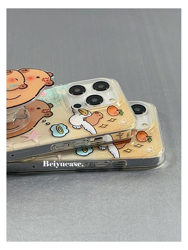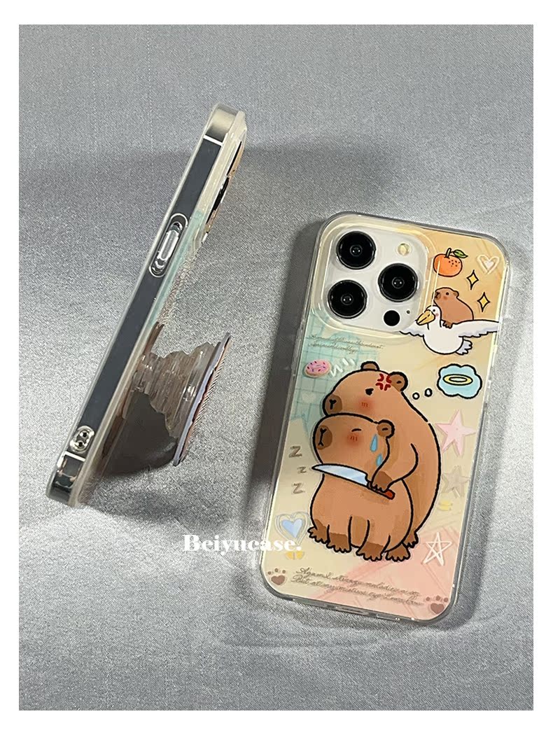 可愛卡通水豚適用蘋果13手機殼iphone14promax新款14pro小眾11帶支架12女13promax硅膠15創意全包保護套軟殼
