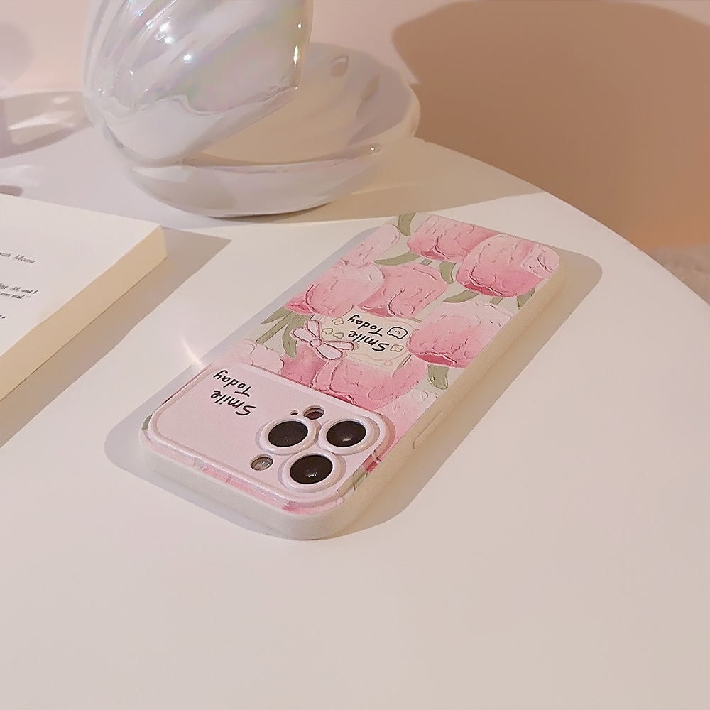 粉粉郁金香花朵15適用于蘋果iPhone13手機殼創意大視窗彩繪14promax保護套12全包防摔11全包防摔清晰網紅女款