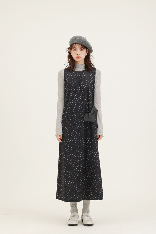 CHACHASTU 復古韓風小碎花疊穿背心裙顯瘦黑色連衣裙女秋冬裙子