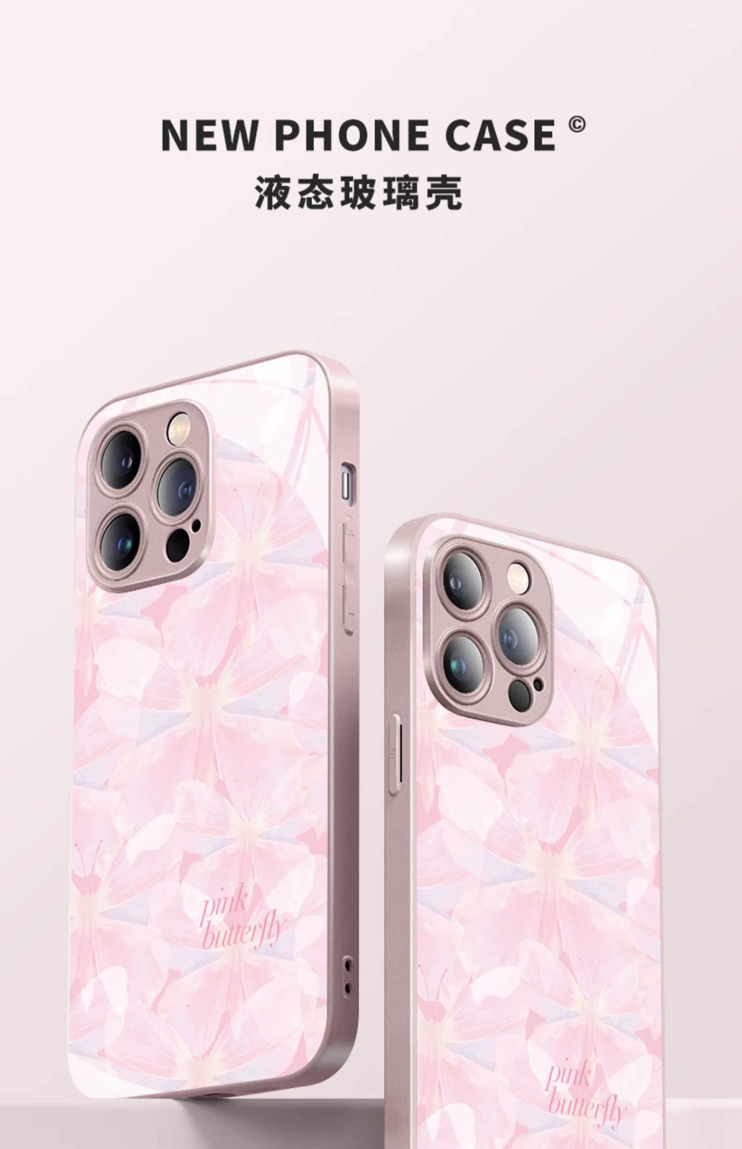 適用于蘋果14pro玻璃手機殼華為mate50pro高級感手機殼小米13創意粉色蝴蝶榮耀90pro鏡頭全包殼小米13防摔殼