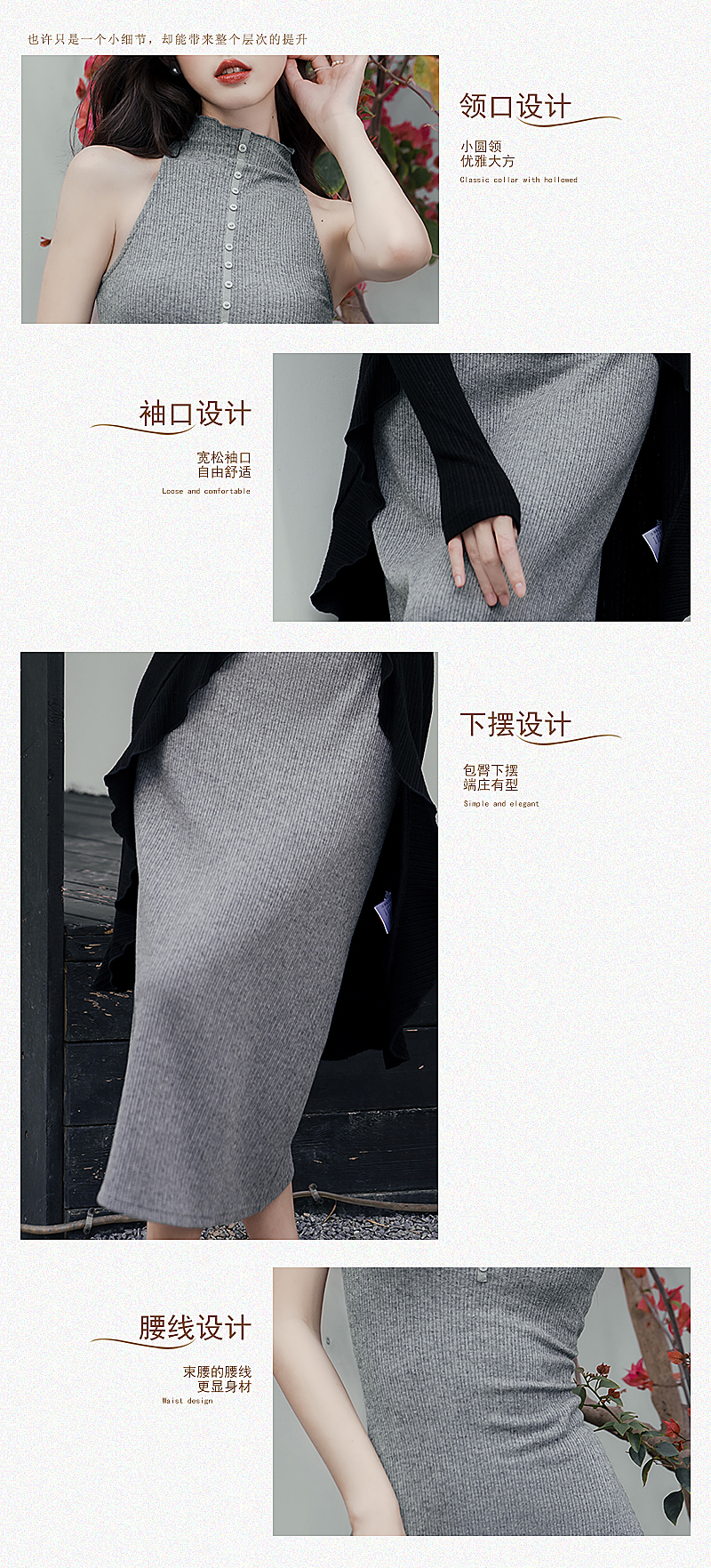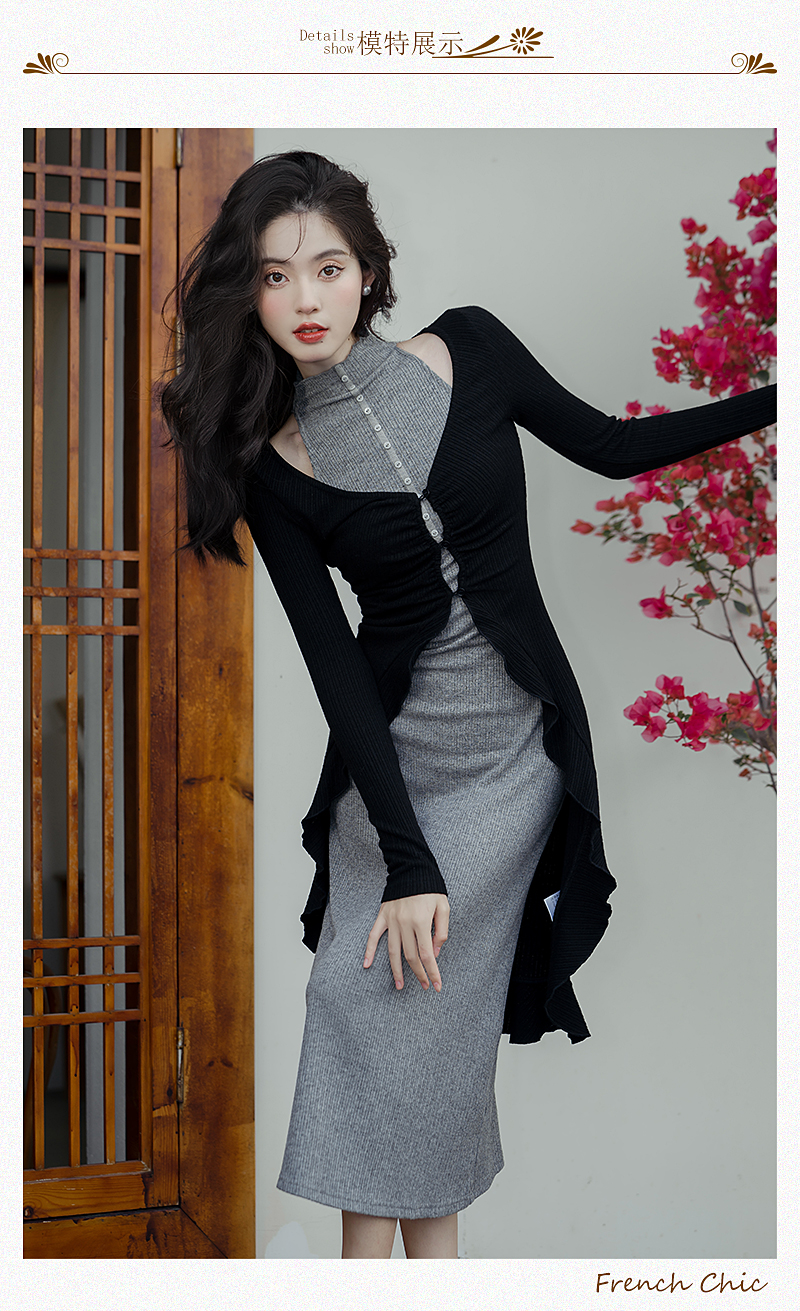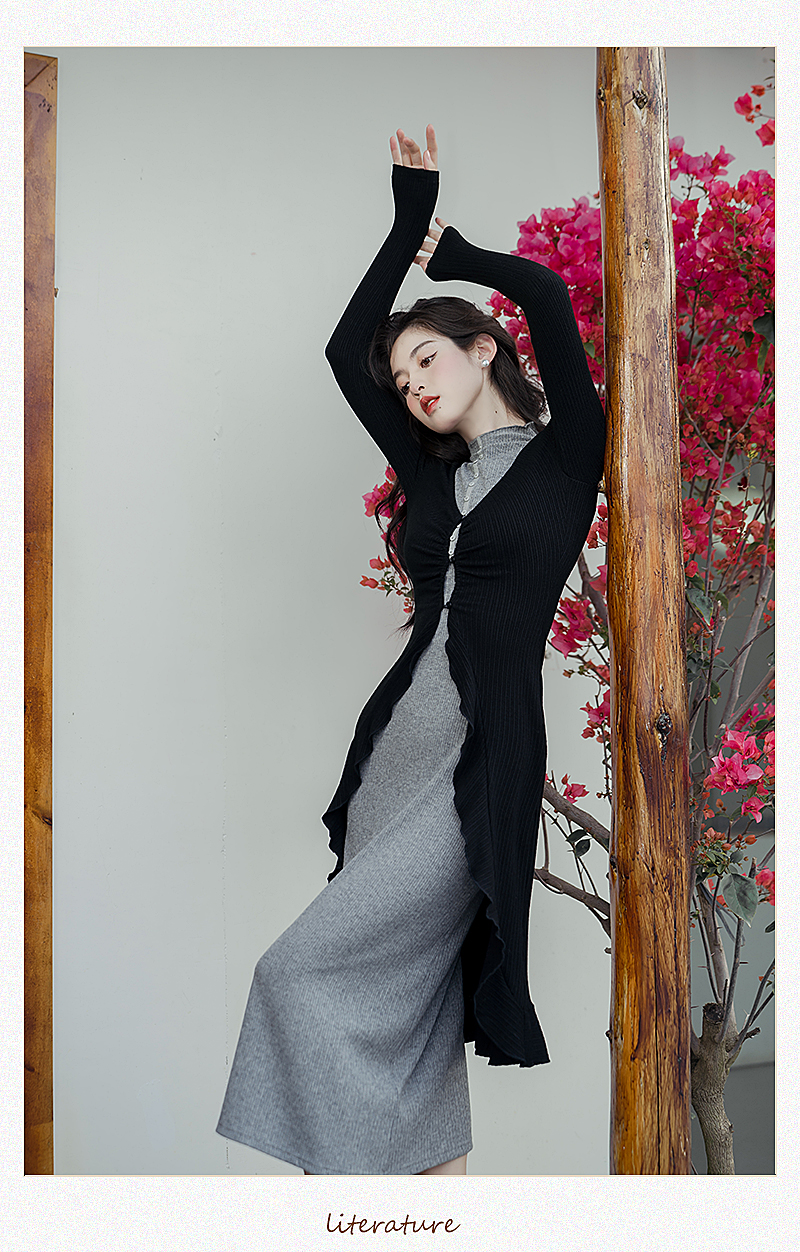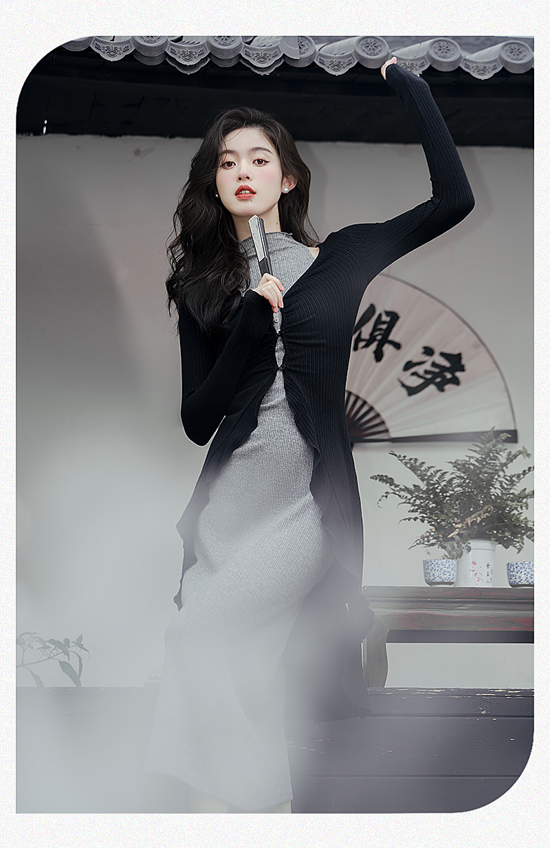 港風高級感套裝黯調墨色黑針織開衫搭配灰針織連衣裙女兩件套秋裝