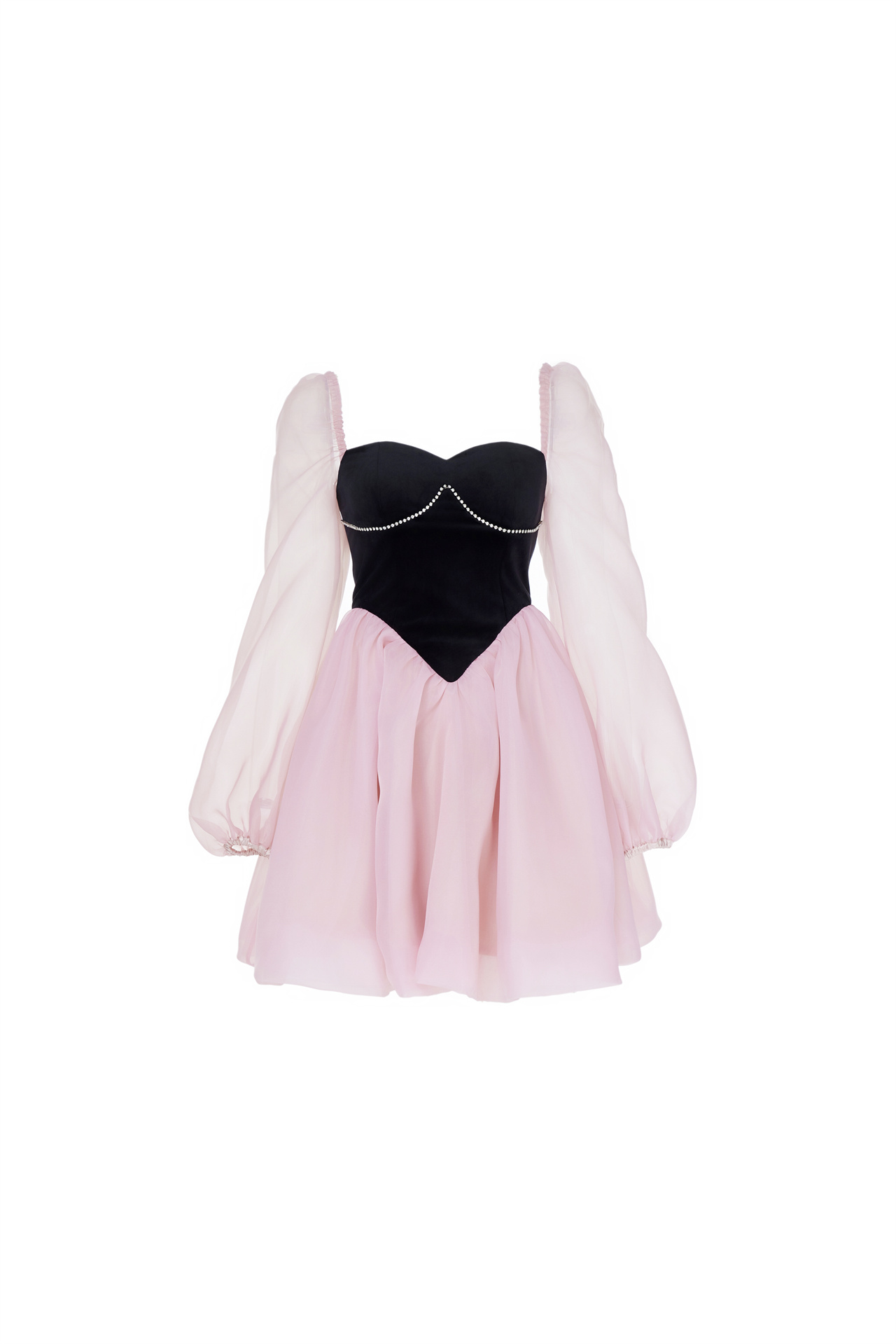 木蘭 GUO JINGYI 2023秋冬新款粉歐根紗拼黑平絨燈籠袖連衣裙百搭