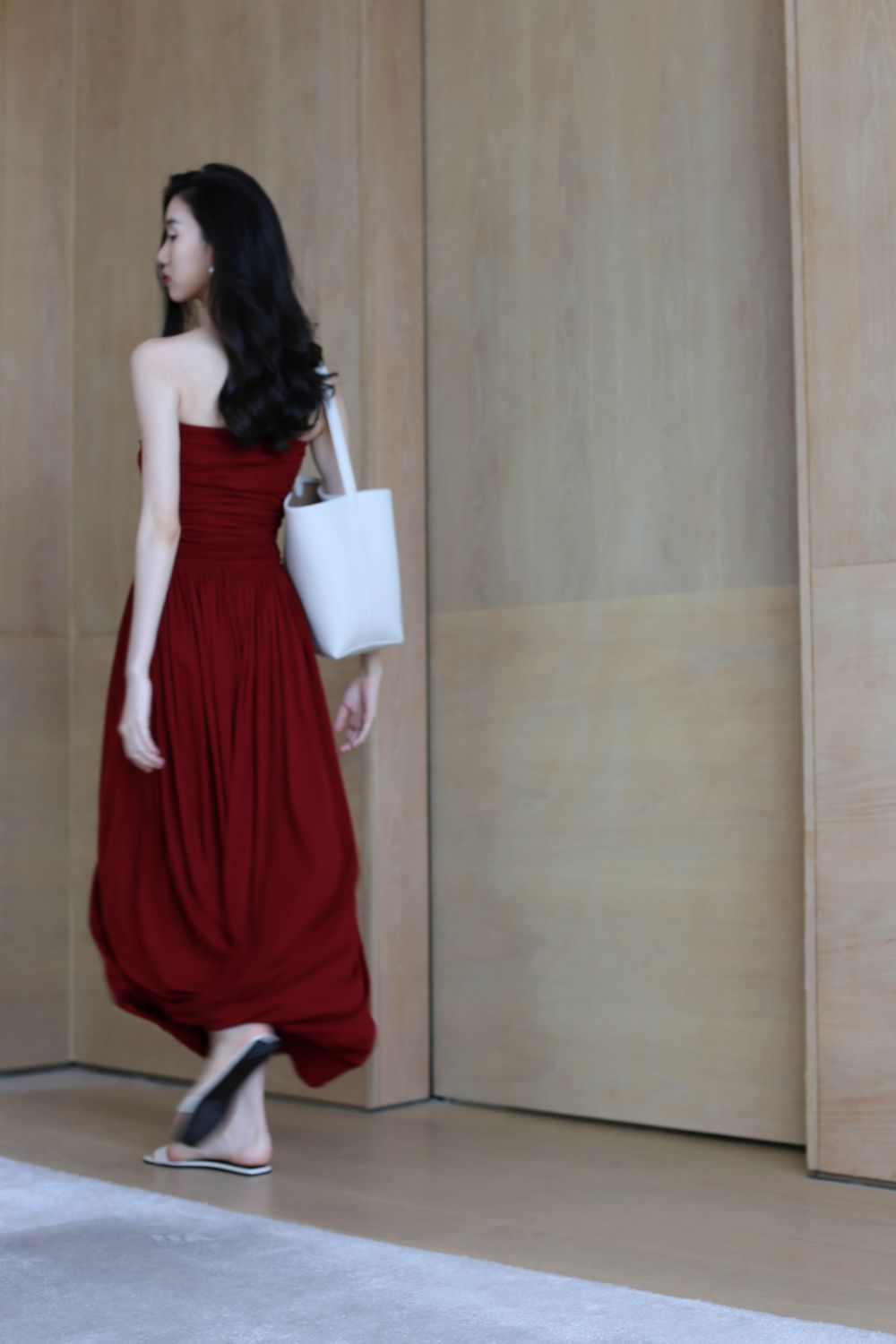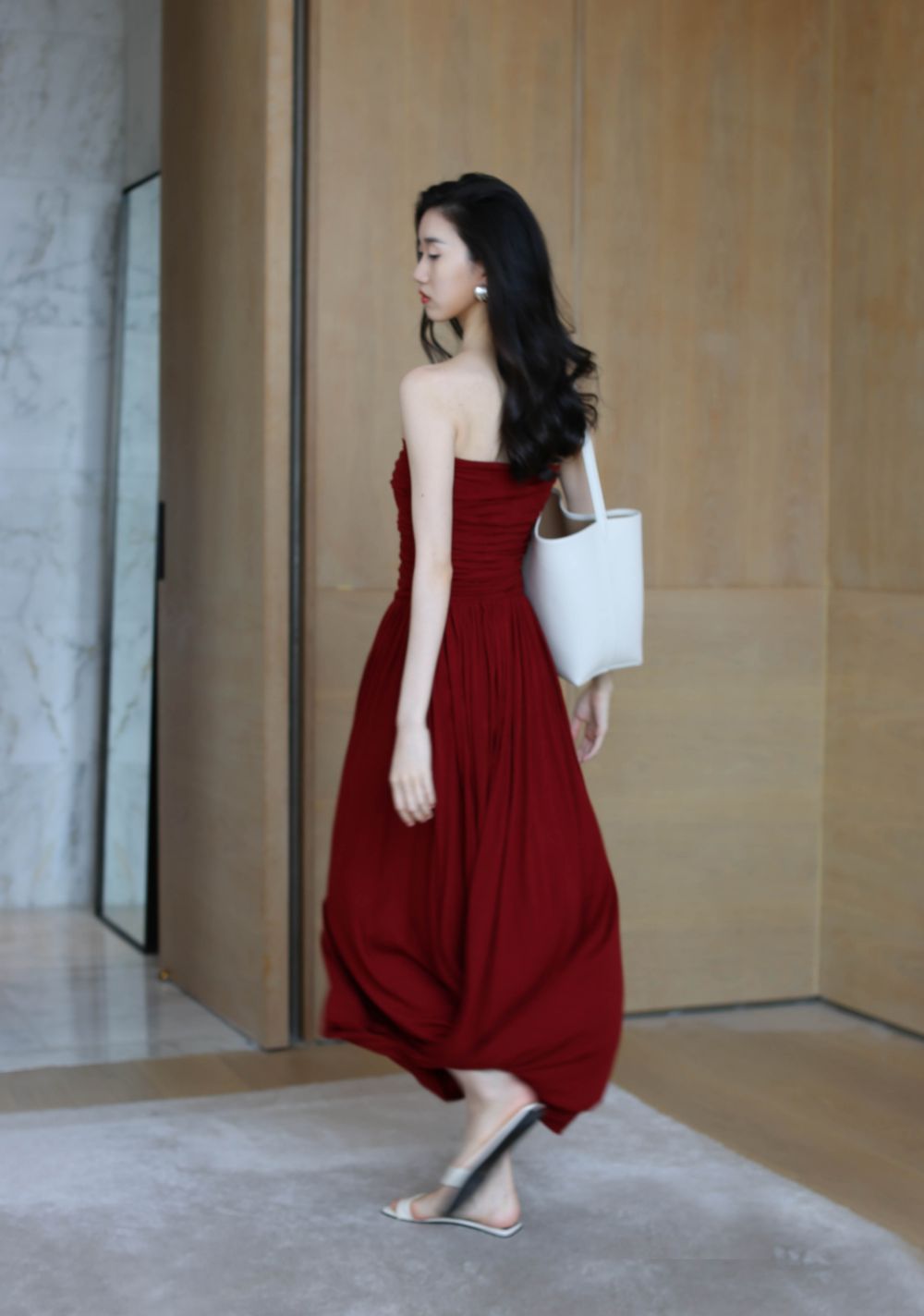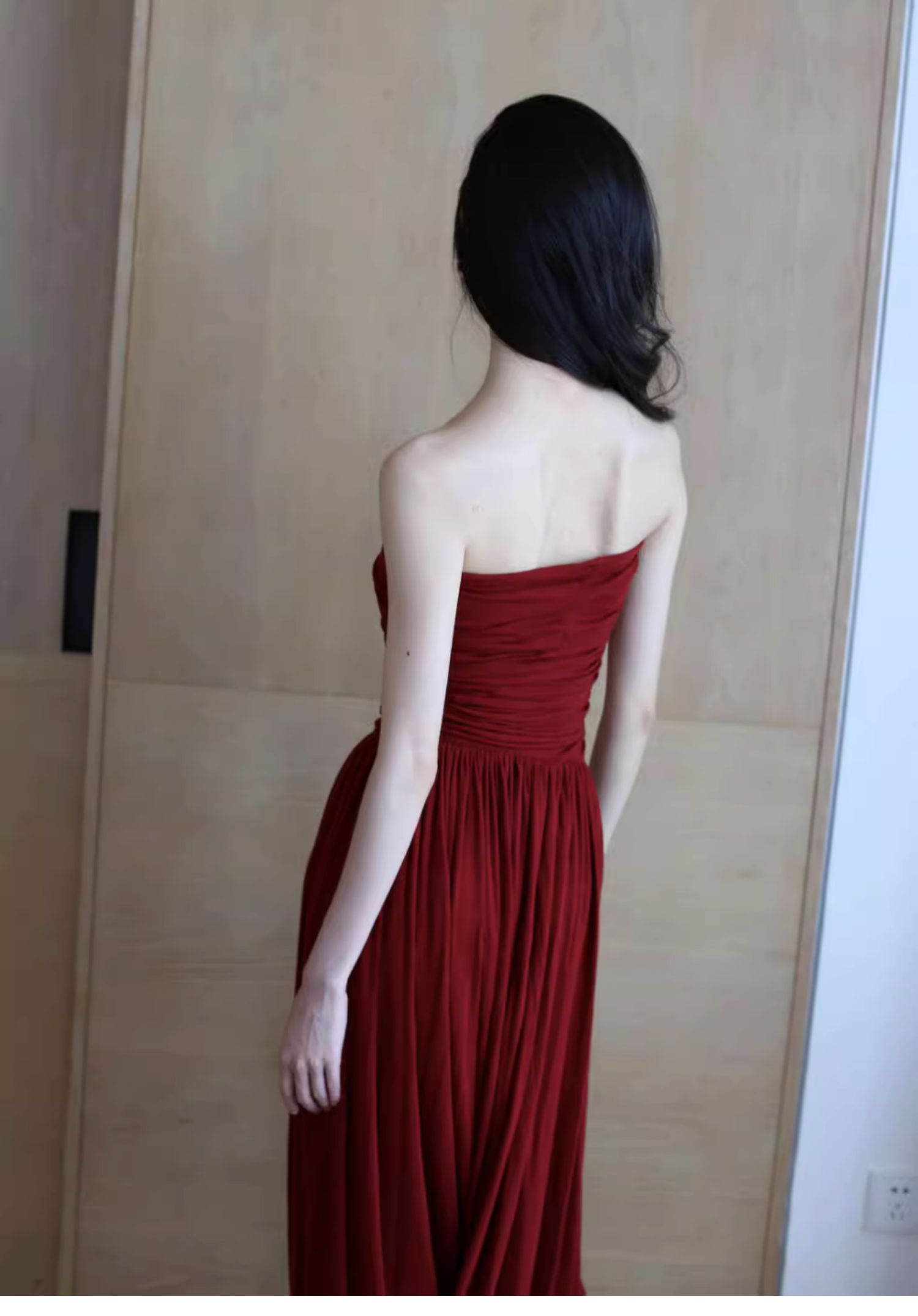 無有無印深酒紅色褶皺顯瘦包裹無袖抹胸式針織連衣裙23291
