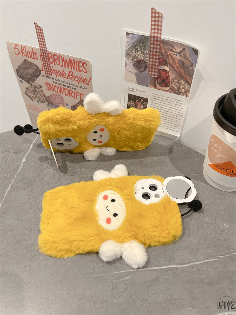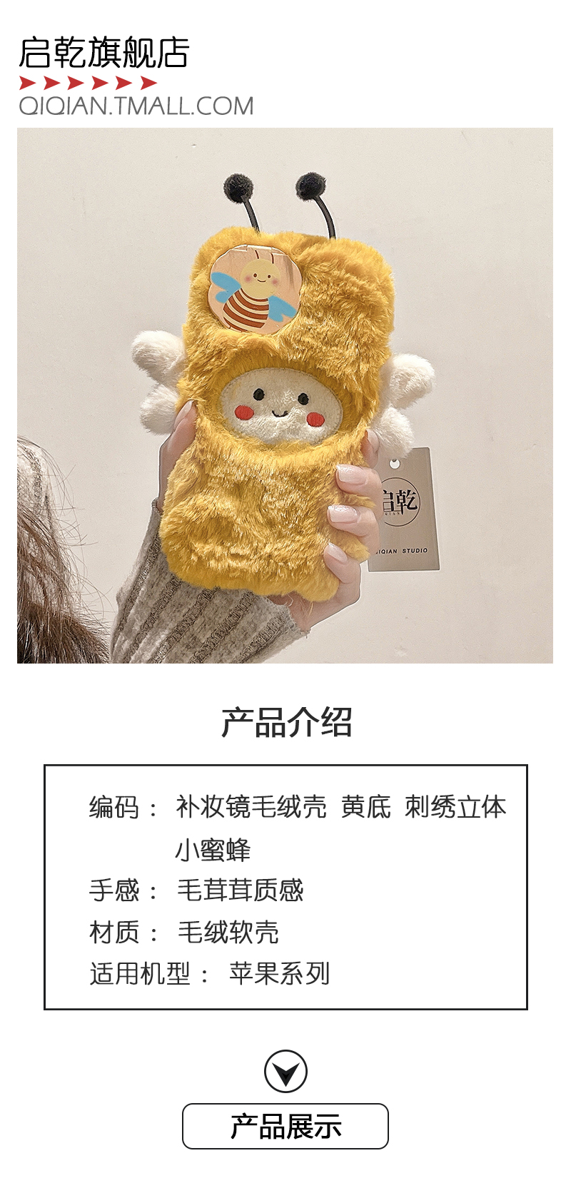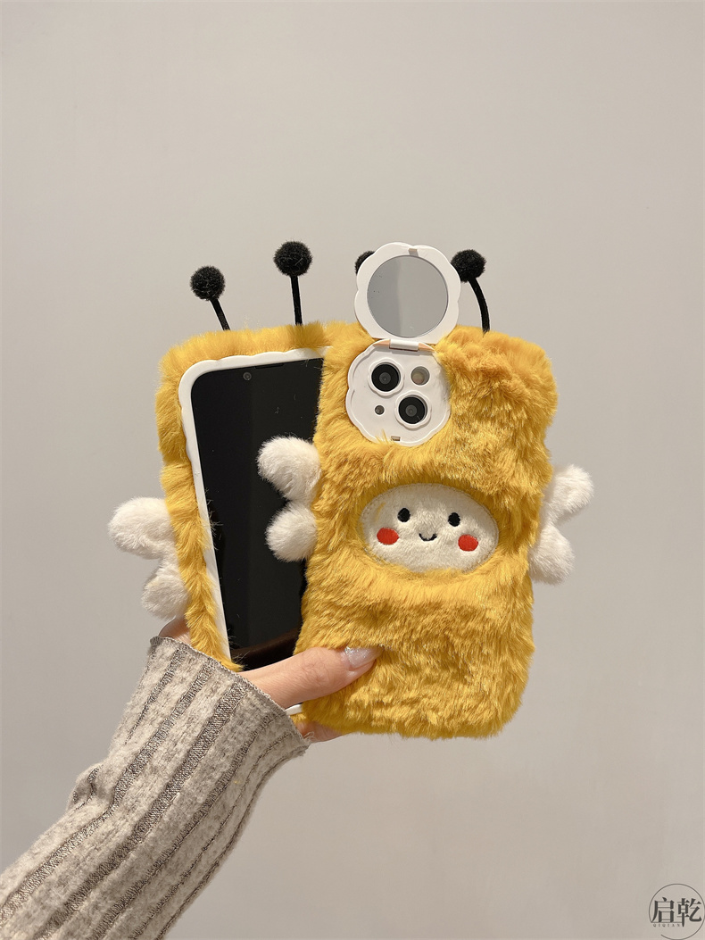 啟乾 毛絨立體刺繡蜜蜂iPhone14手機殼適用蘋果13promax翻蓋鏡面12/11可愛卡通鏡子新款絨布毛茸茸秋天冬天女