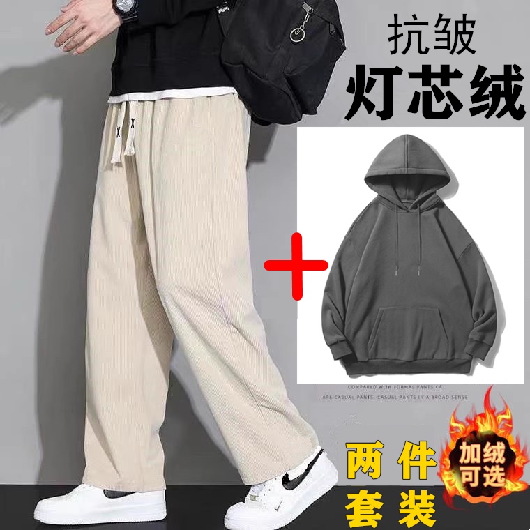 燈芯絨加絨褲子男褲秋冬款潮流寬松直筒褲闊腿運動休閑套裝男冬季