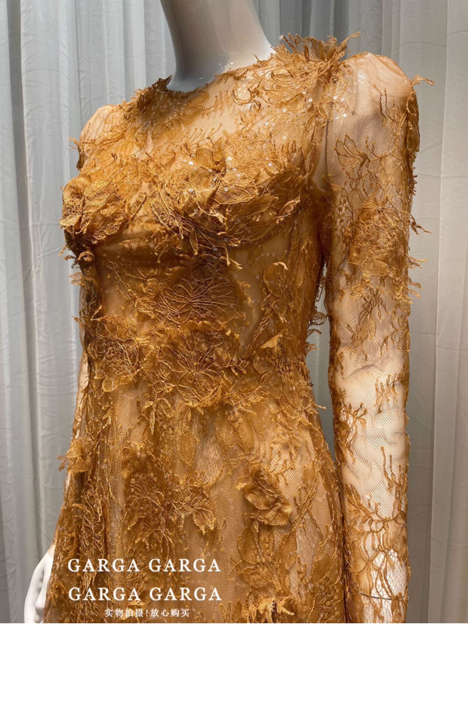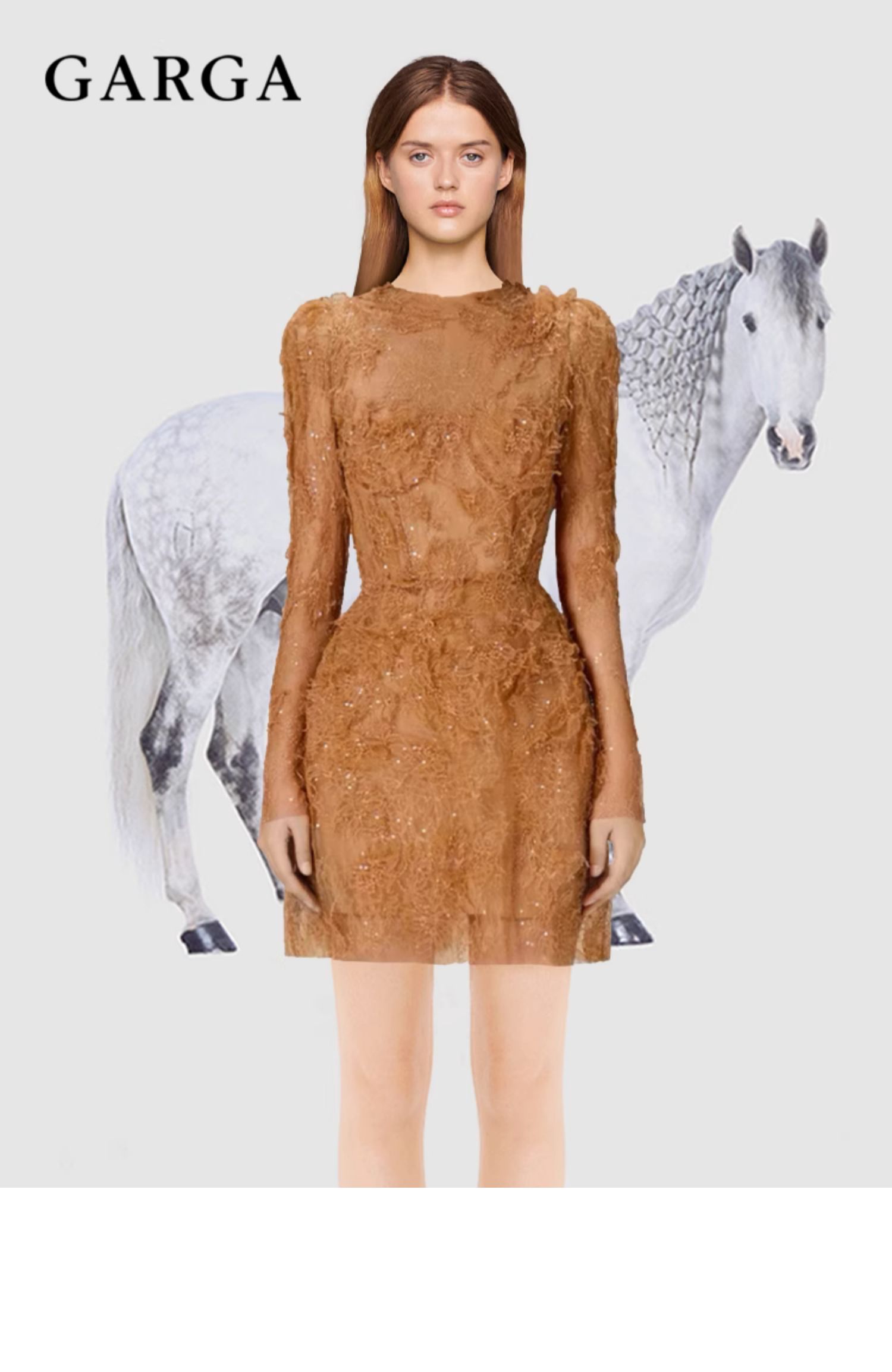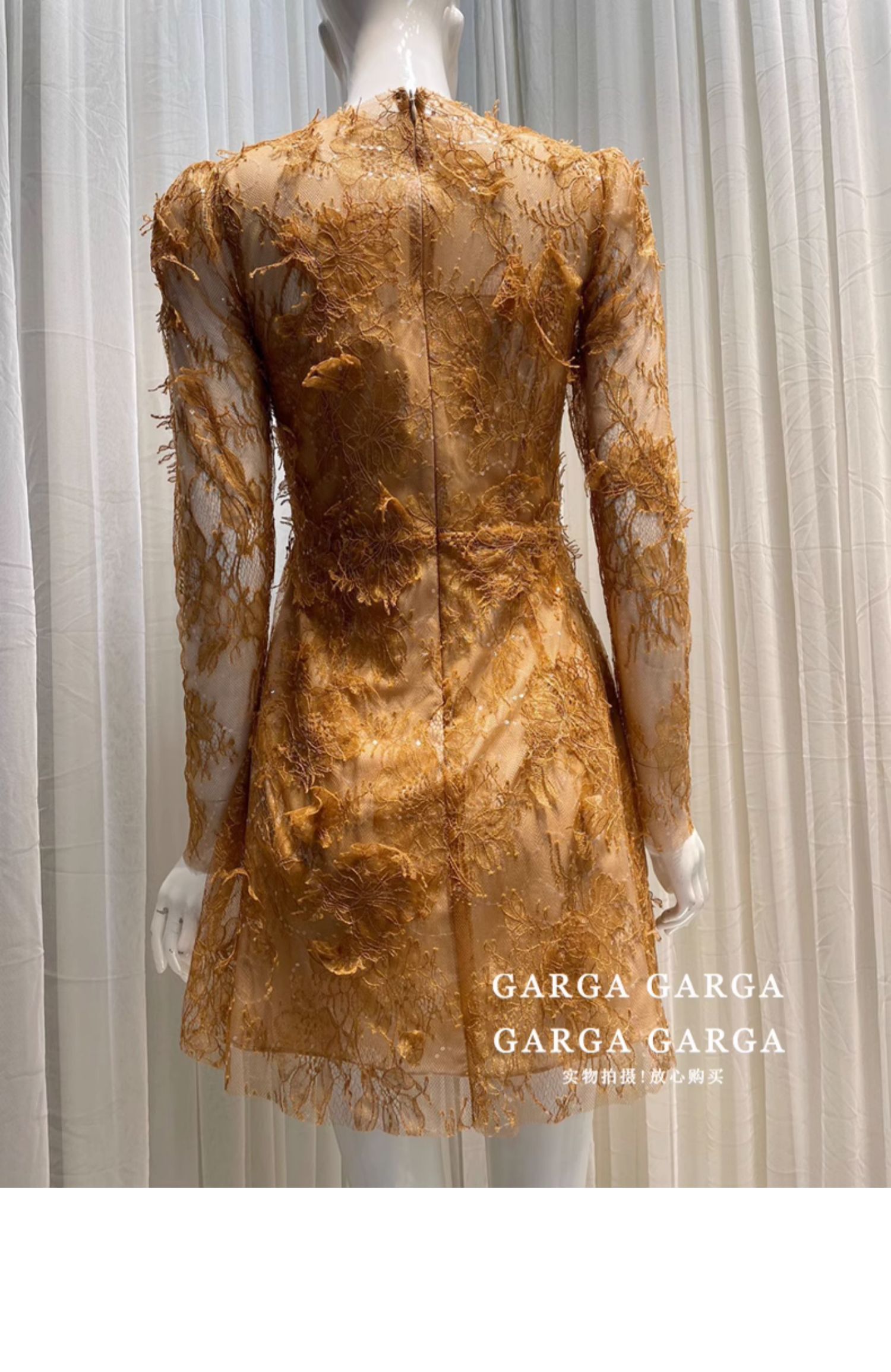 GARGA名媛氣質咖色重工網紗拼接連衣裙女設計感立體花朵收腰短裙