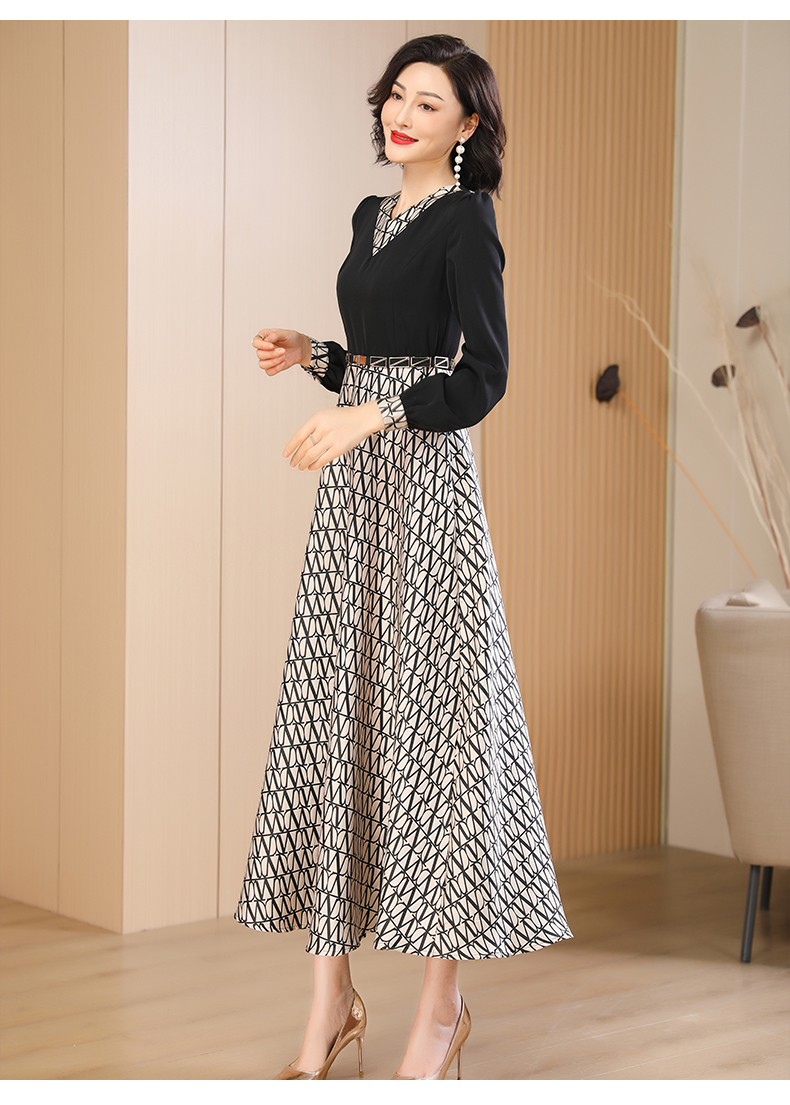 送腰帶黑色花色拼接絲絨2023連衣裙
