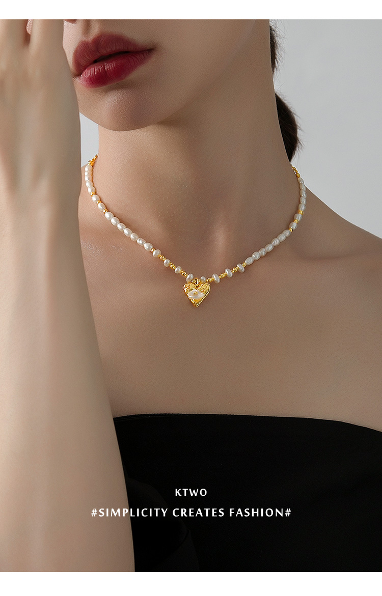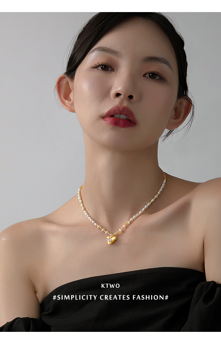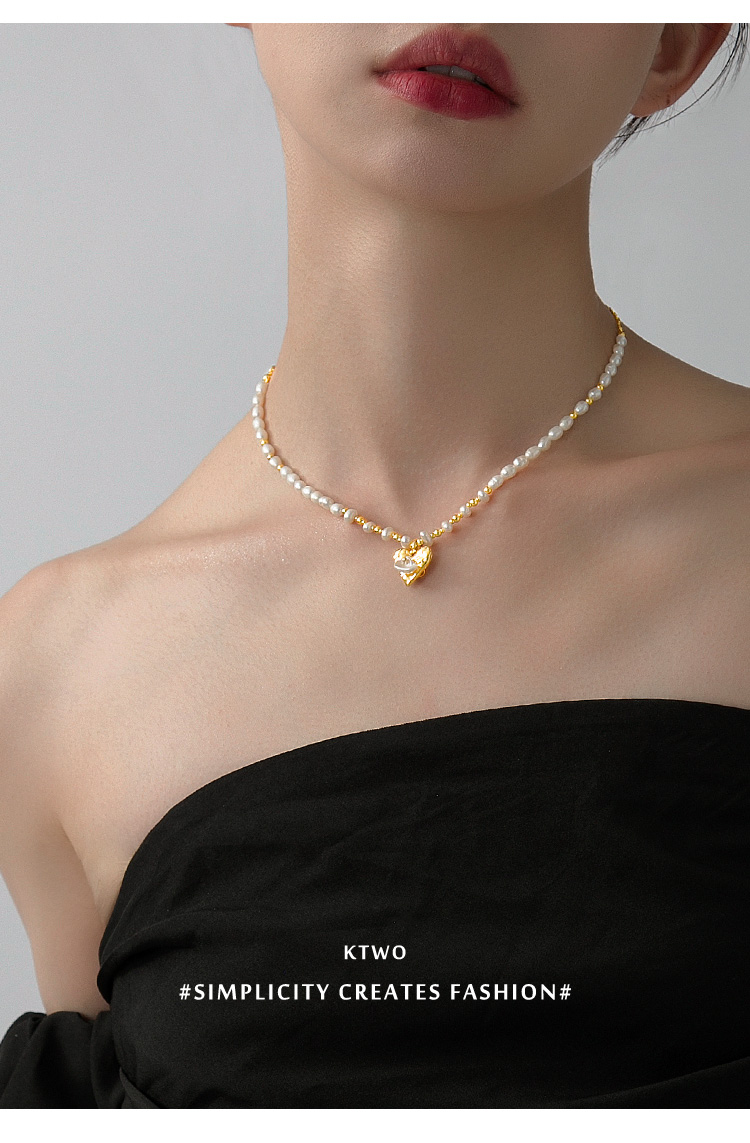 天然珍珠鏈項鏈女輕奢大氣拼接設計鍍k金愛心吊墜高端鎖骨鏈頸鏈