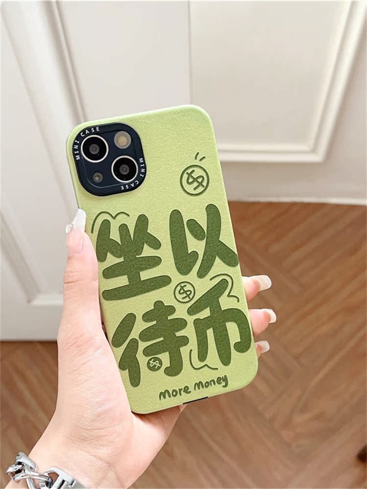 創意情侶男女款中國風皮紋綠色坐以待幣文字個性iPhone14ProMax手機殼適用12蘋果13全包邊鏡頭防摔保護套新品