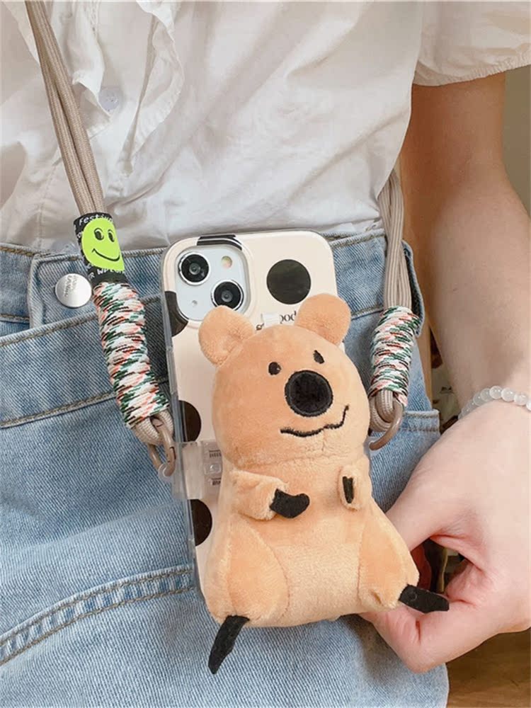 呆萌可愛卡通毛絨玩偶小熊背夾掛繩斜挎黑色蝴蝶結波點iPhone14ProMax手機殼適用12蘋果13全包邊鏡頭防摔保護