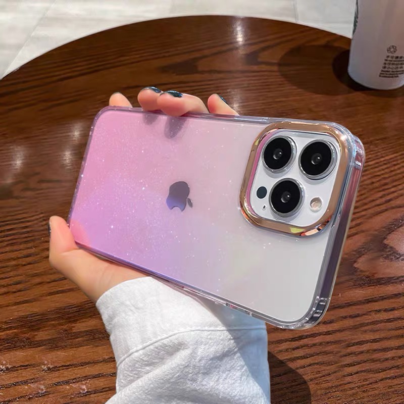 漸變閃粉適用蘋果15Promax手機殼新款暗紫色透明硬殼iPhone14pro帶鏡頭膜高檔11Pro保護套Plus女奢華13P簡12