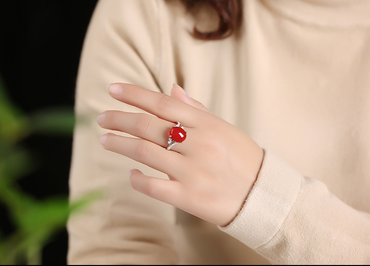 天然瑪瑙氣質純銀戒指女紅瑪瑙活口戒祖母綠玉髓隨形復古開口可調