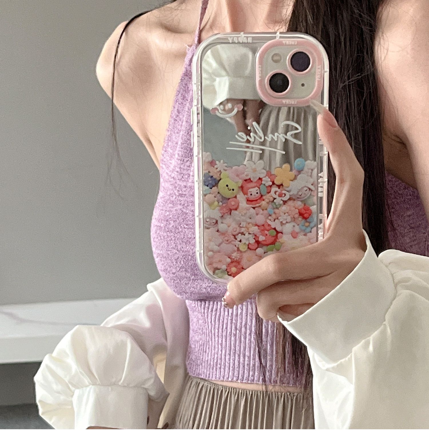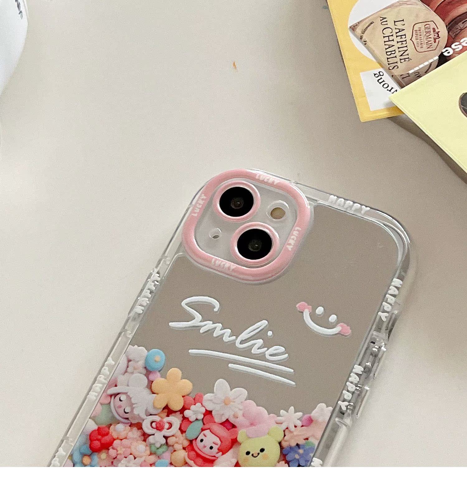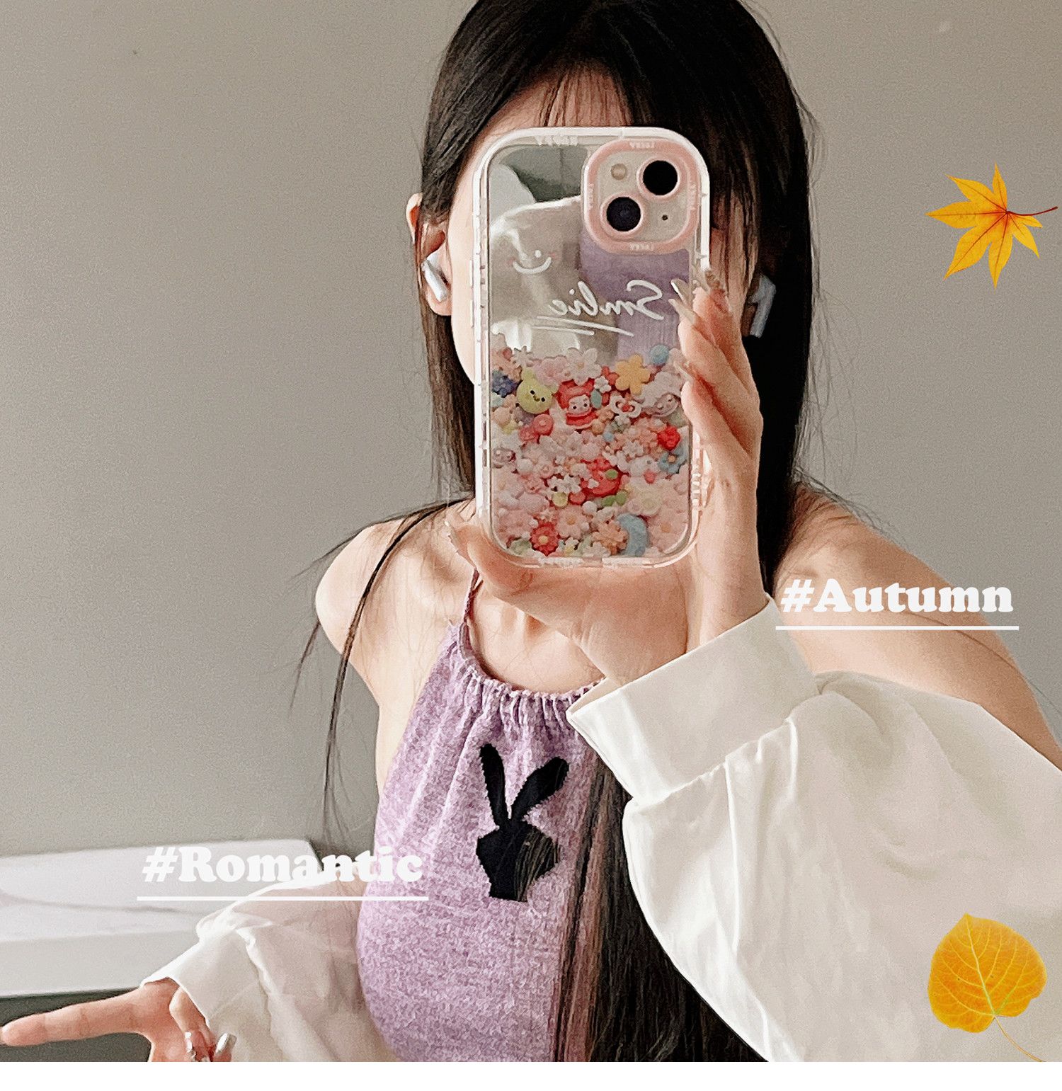 補妝鏡花堆小兔子適用iphone14pro蘋果15手機殼11鏡面12pro小眾13promax全包鏡頭防摔保護套女韓國笑臉高級感