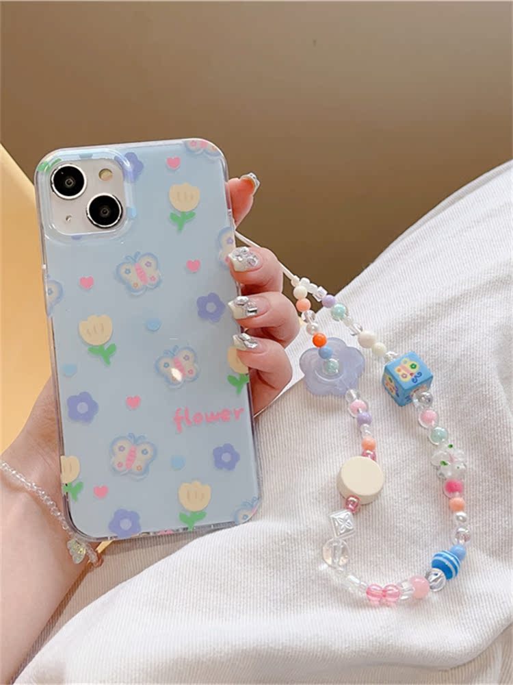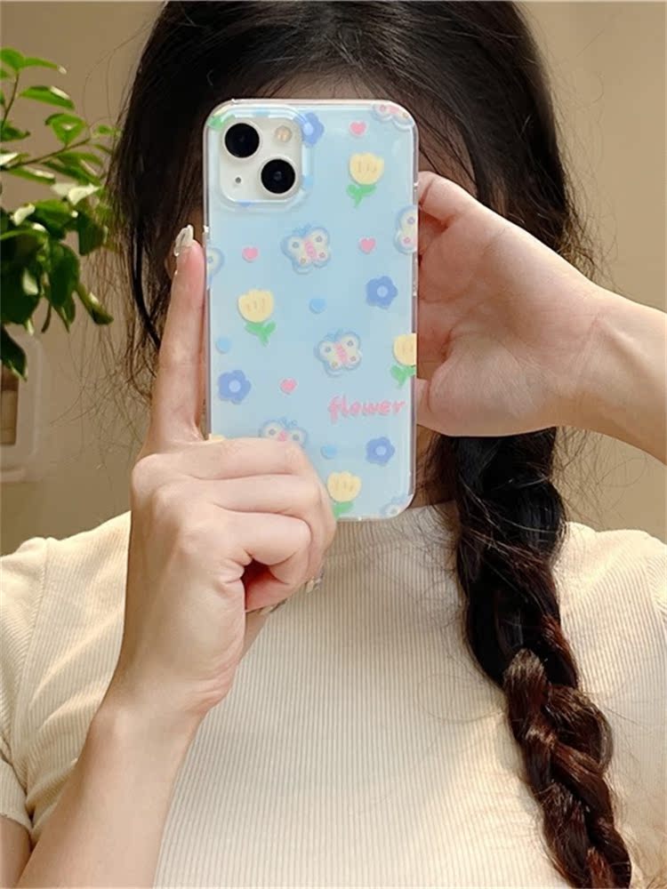 小清新文藝唯美女生藍色底滿屏蝴蝶郁金香花朵串珠鏈iPhone14ProMax手機殼適用12蘋果13全包邊鏡頭防摔保護套