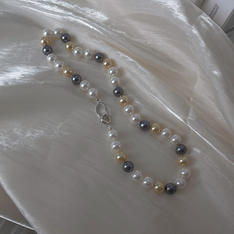 S925純銀重工倪妮同款銀珠混搭大溪地色珍珠項鏈輕奢小眾鎖骨鏈女