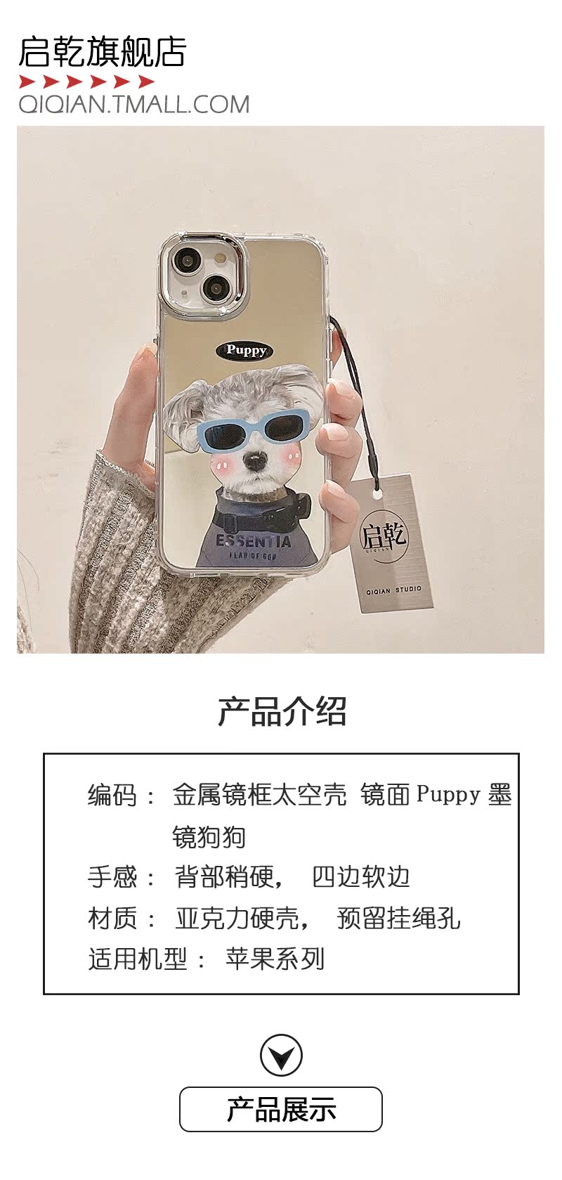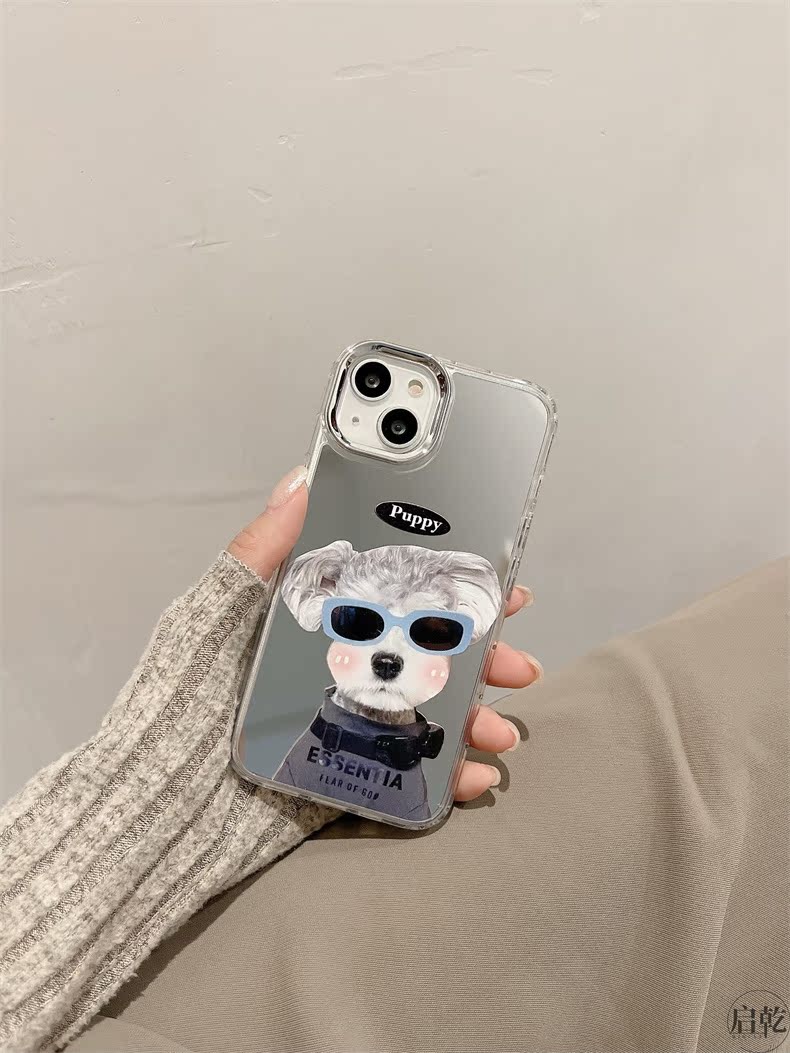 啟乾 鏡面墨鏡狗狗iPhone14手機殼適用蘋果13promax硬殼12/11可愛卡通小眾趣味創意網紅新款防摔女補妝鏡子