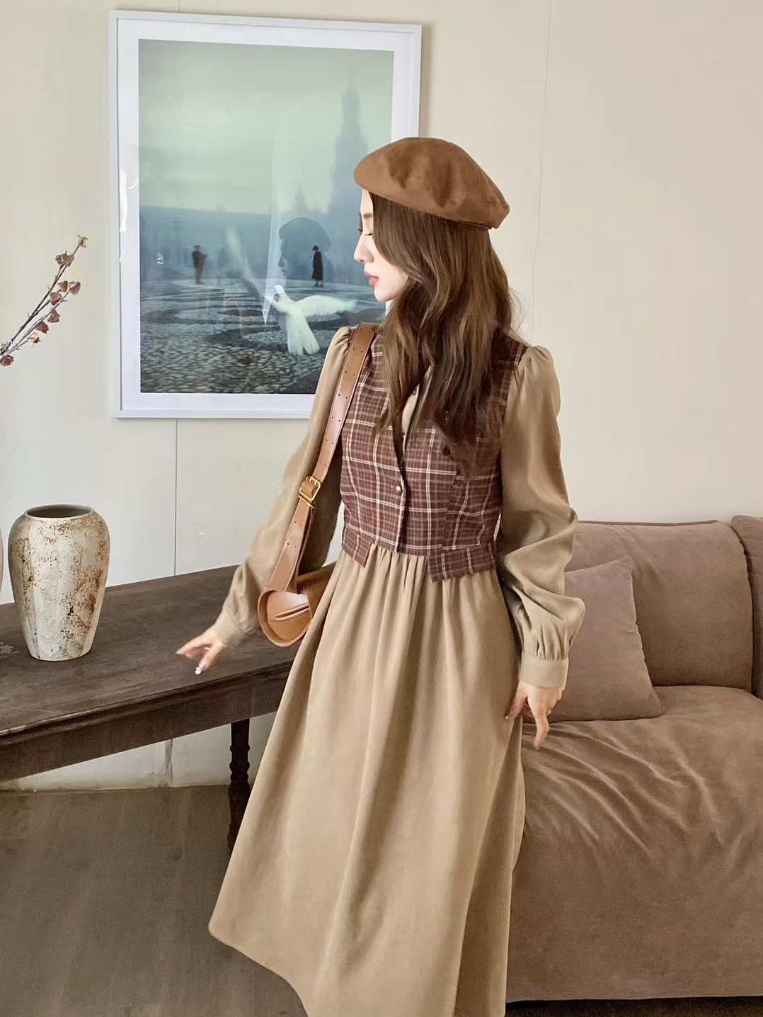 法式高級感假兩件茶歇通勤馬甲式連衣裙2023秋裝新款時尚長裙女