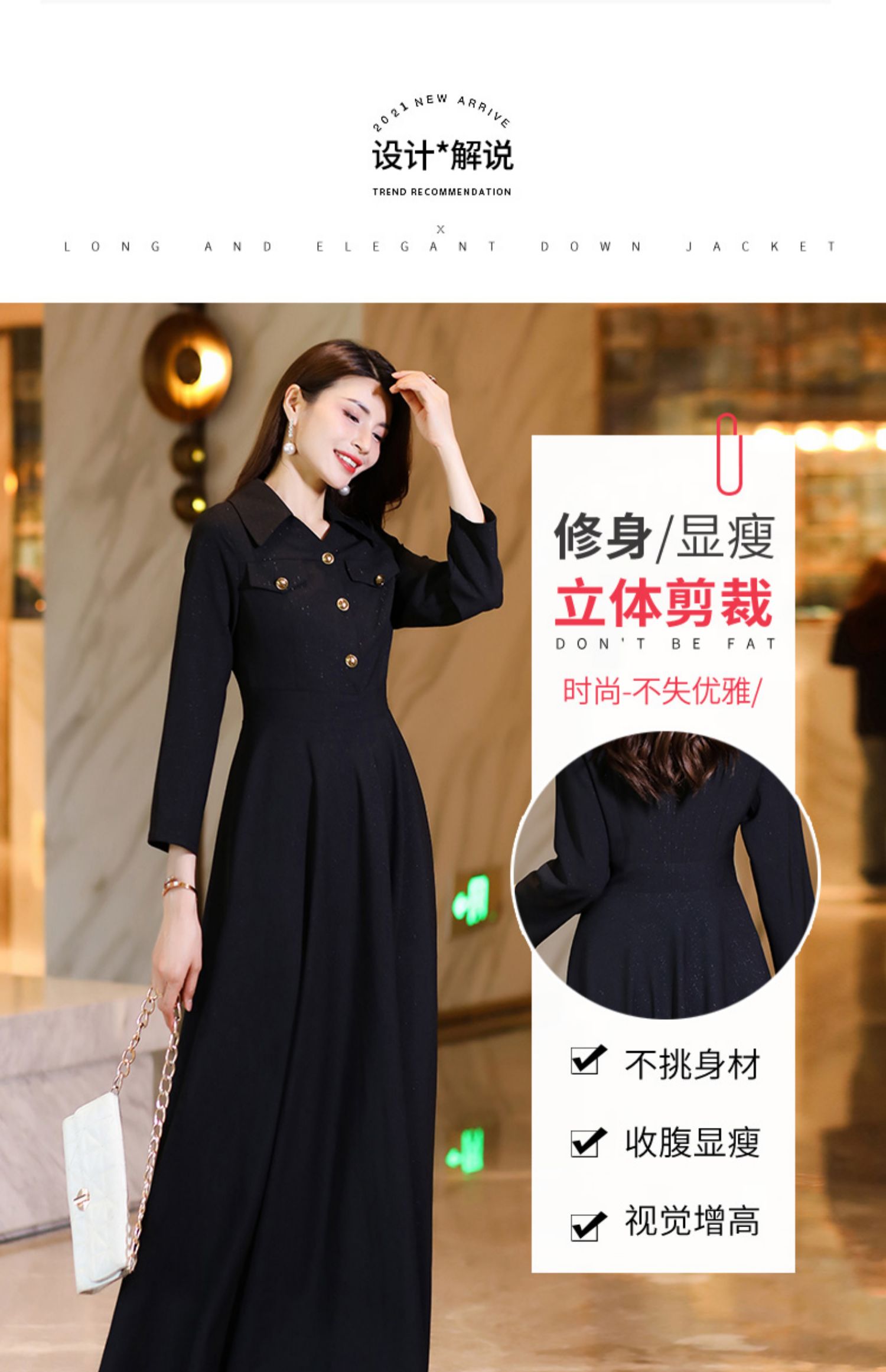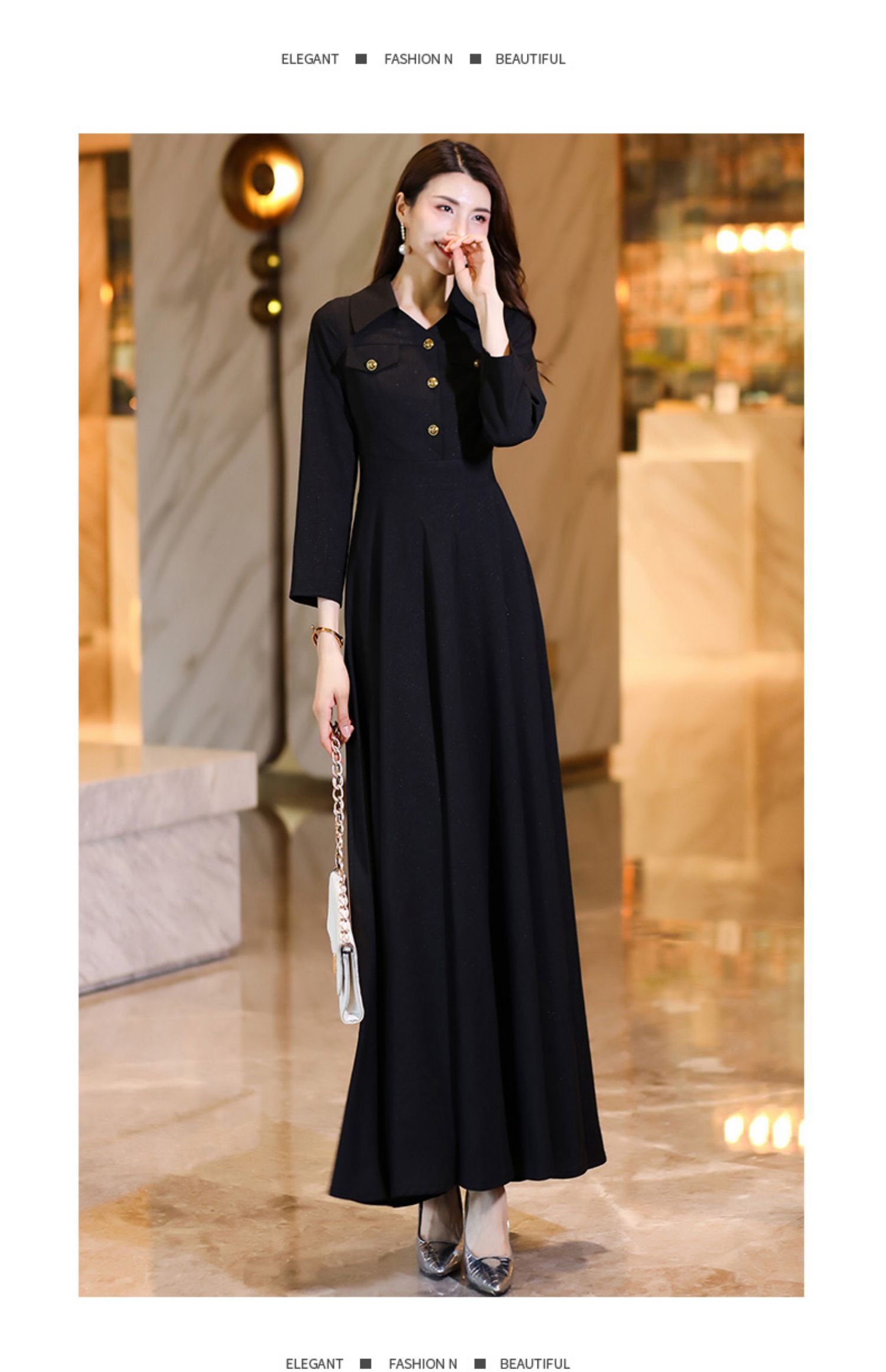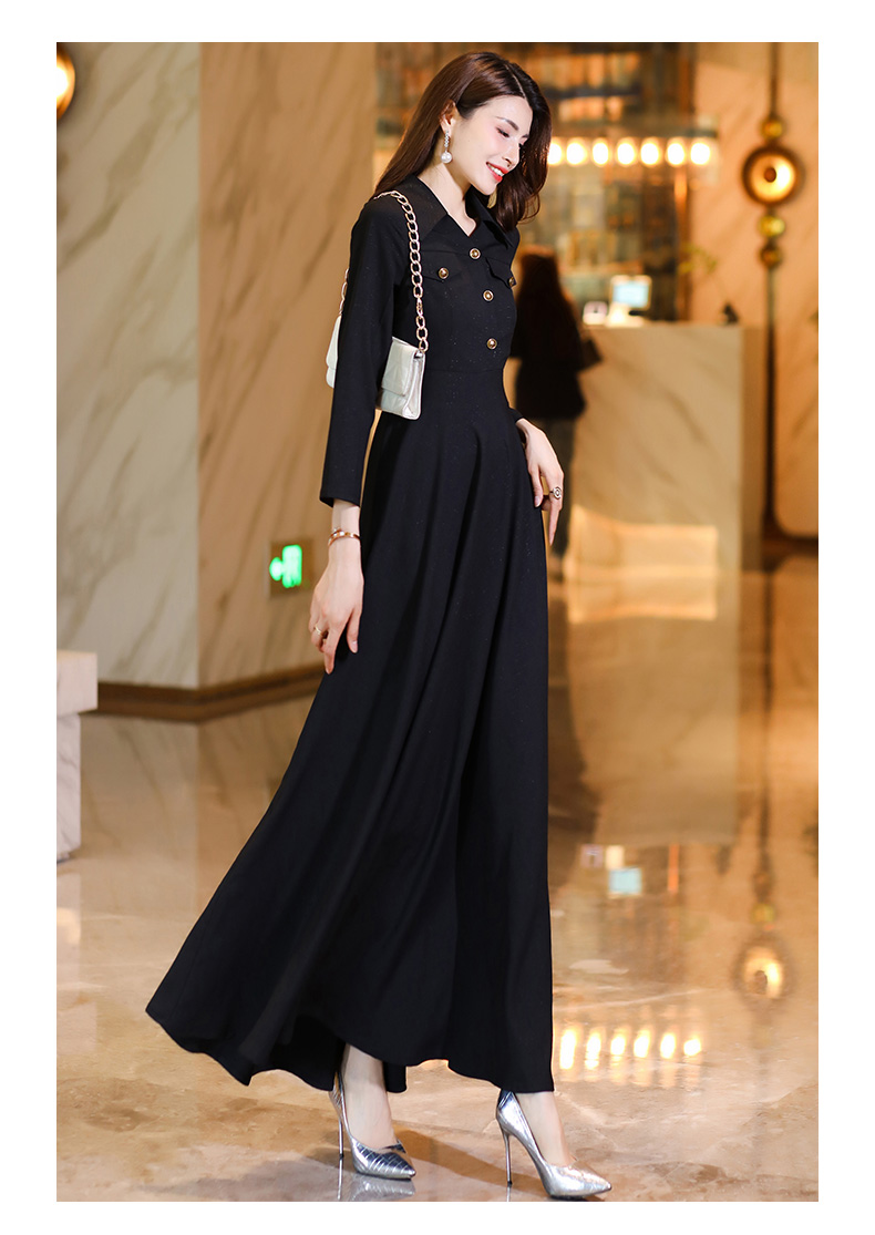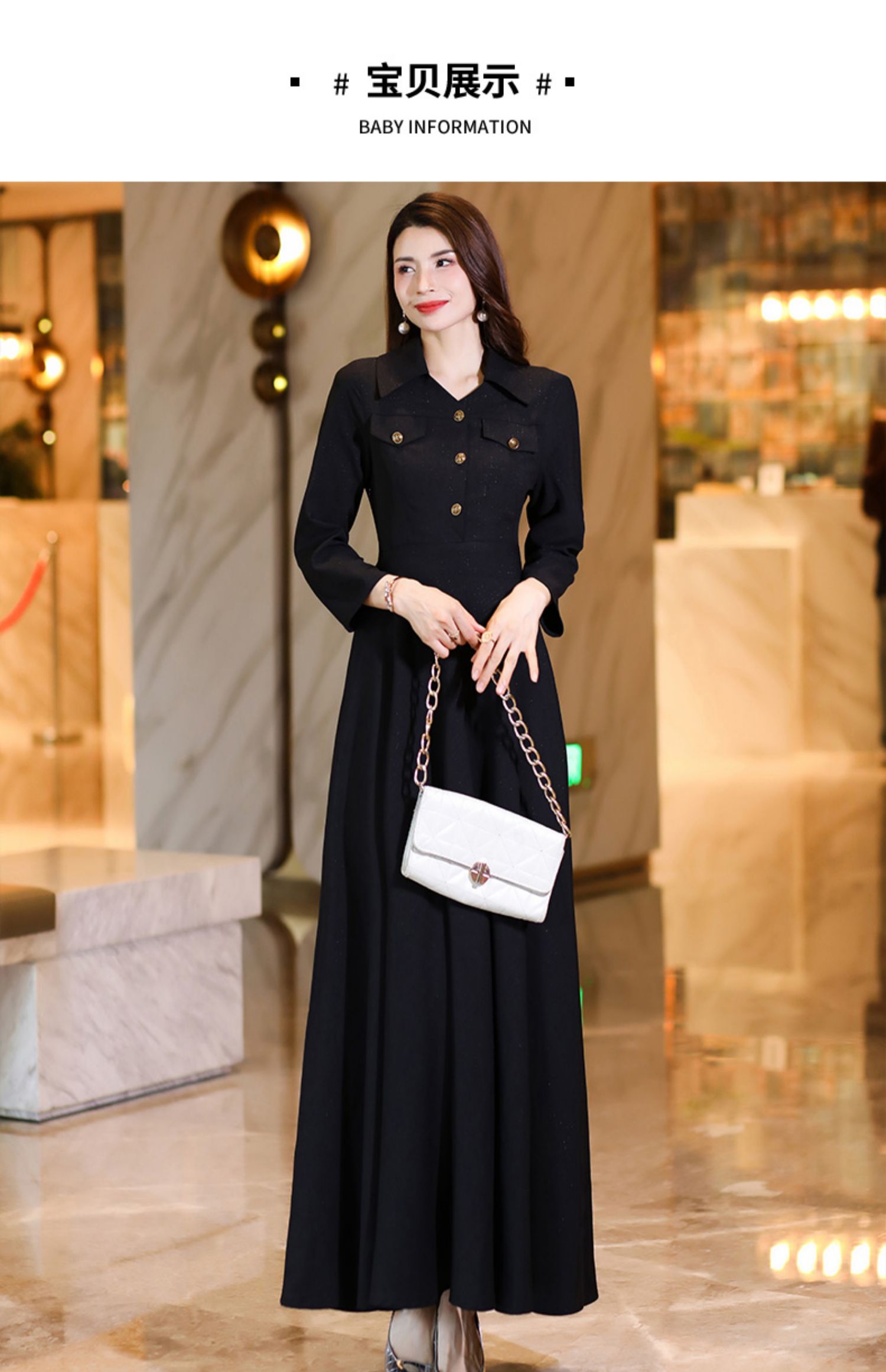 春秋黑色長袖翻領連衣裙女長款到腳踝2023新款超長大擺職業西裝裙