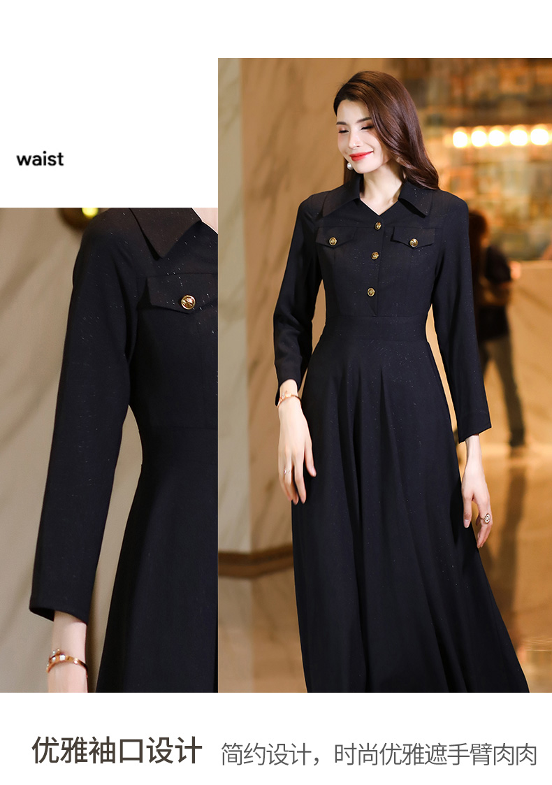 秋季黑色2022秋收腰長袖氣質連衣裙