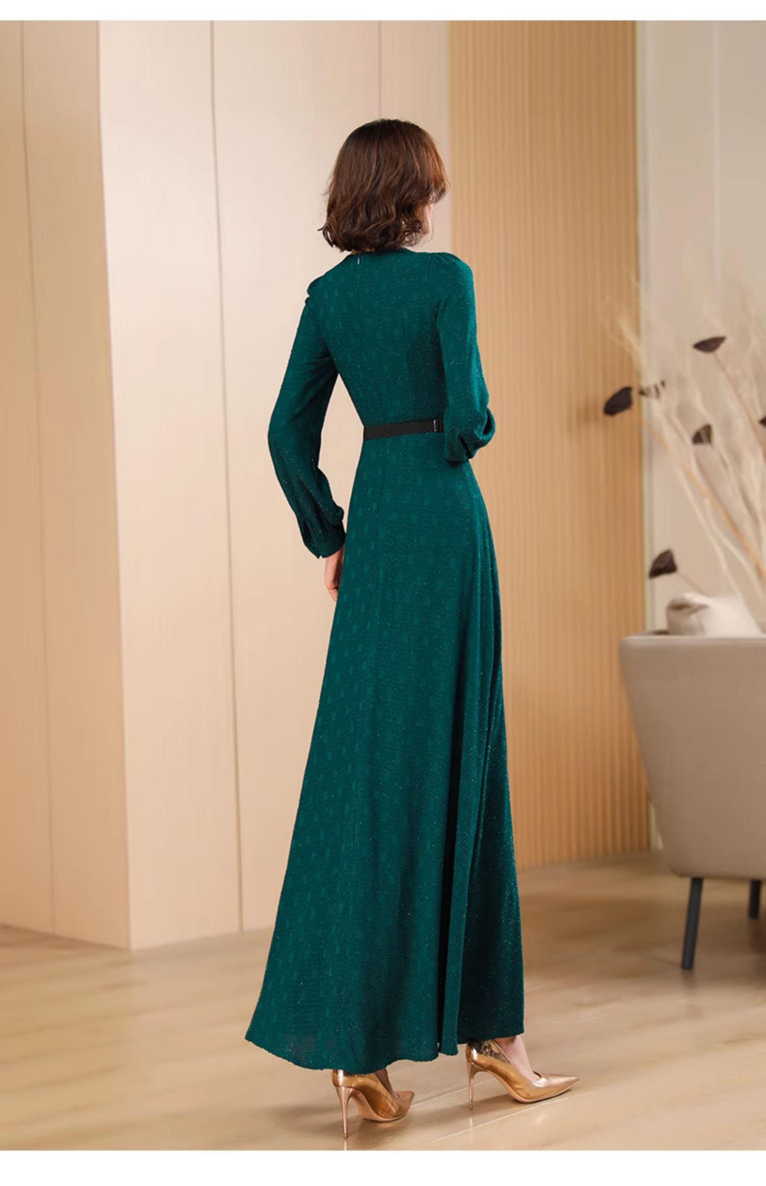 帝弗潤馳2023早秋新款高端洋氣青綠色收腰長款連衣裙及踝大擺裙