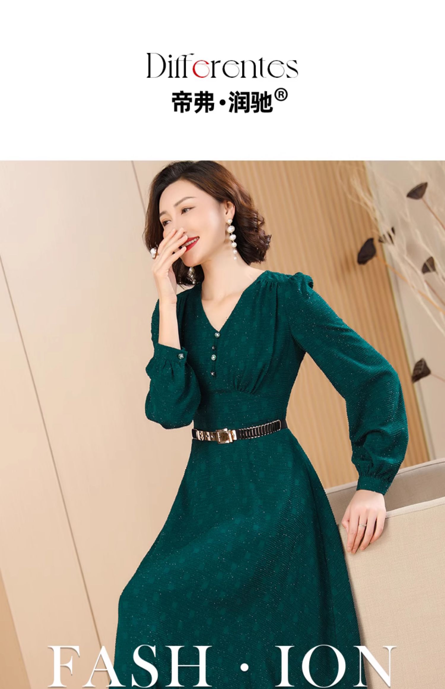 帝弗潤馳2023秋裝新款洋氣減齡連衣裙長款墨綠色雪紡提花及踝長裙