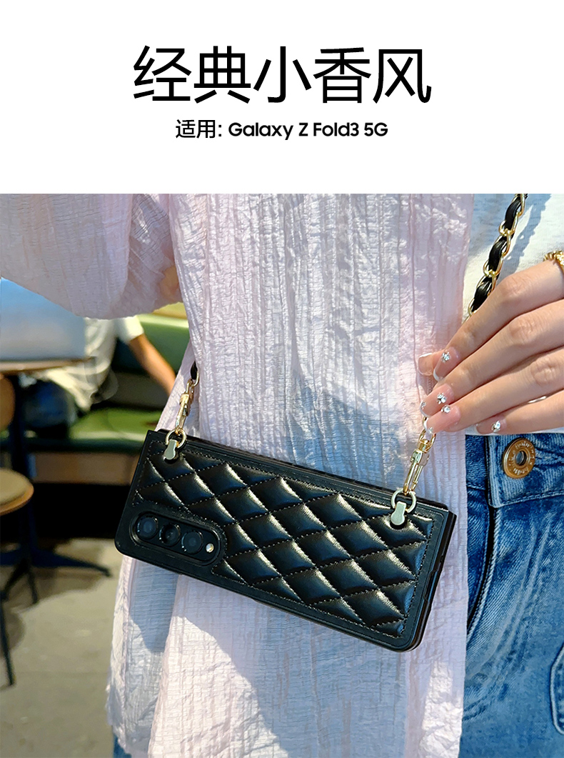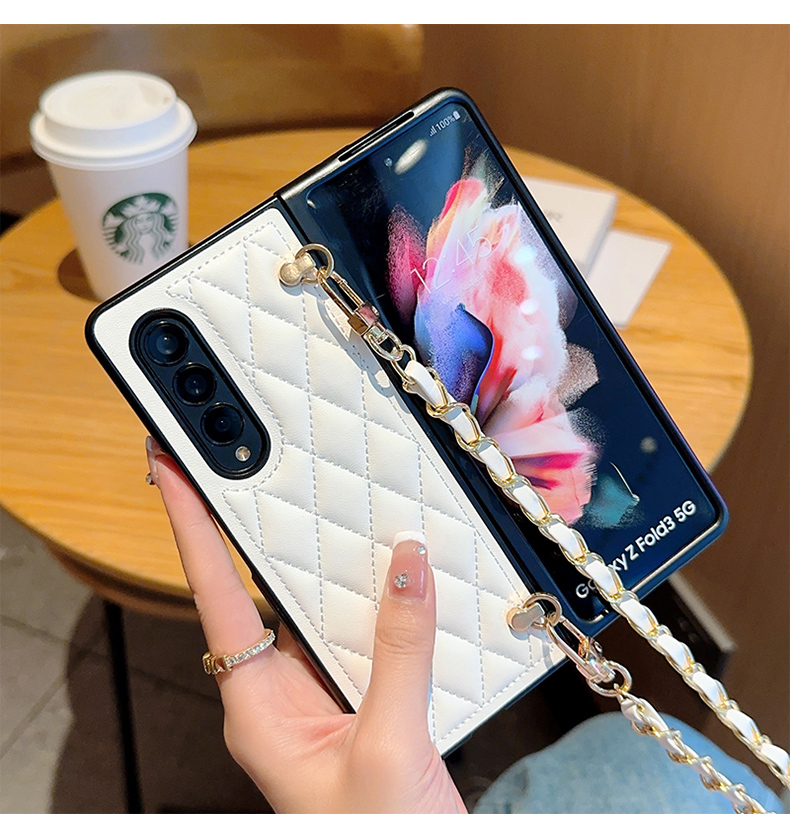適用于三星Z Fold3手機殼菱格小香風斜挎鏈條ZFold4折疊屏高級感日韓ins女w22防摔皮質w23背帶式奢華新款