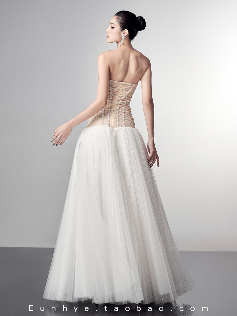 越南小眾品牌LYLIA 2023年秋季限定杏色釘珠抹胸拼接白色網紗長裙