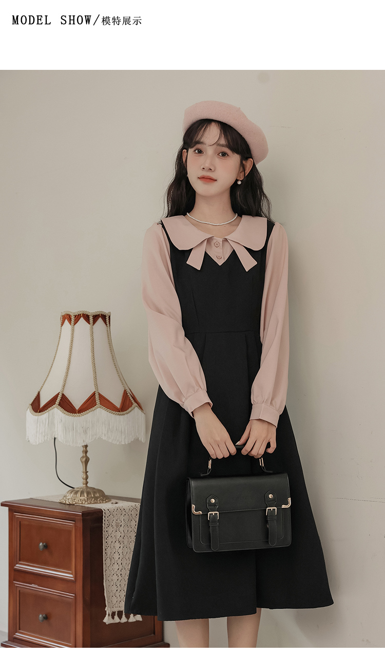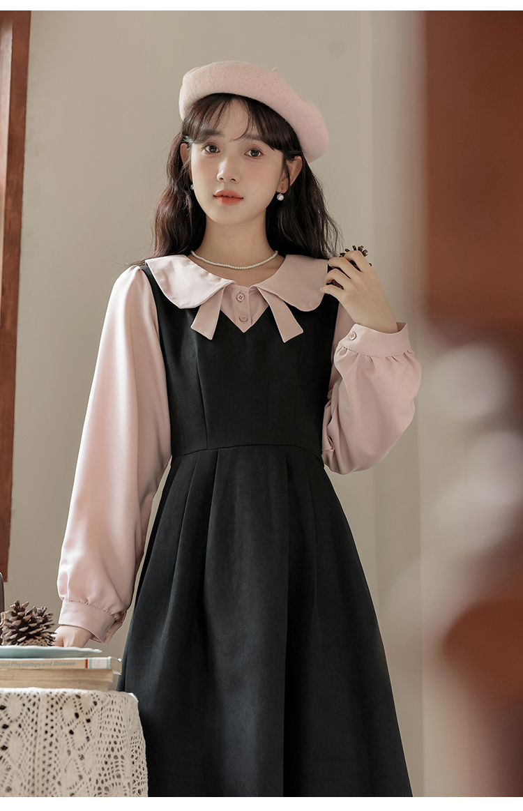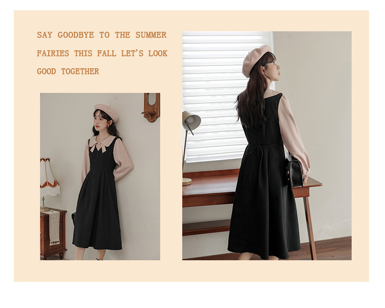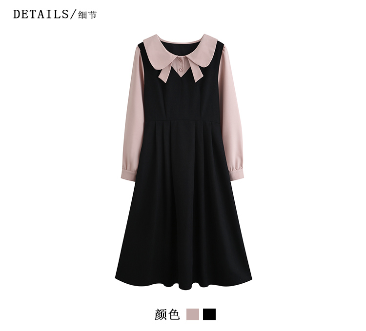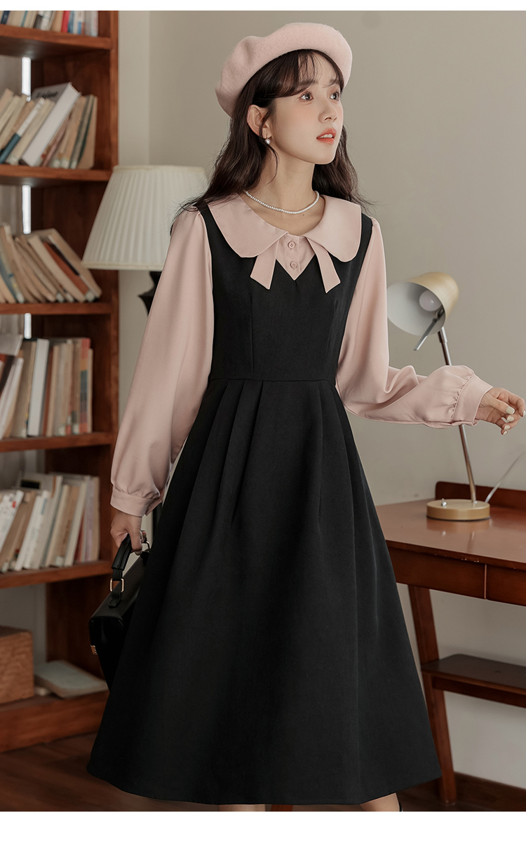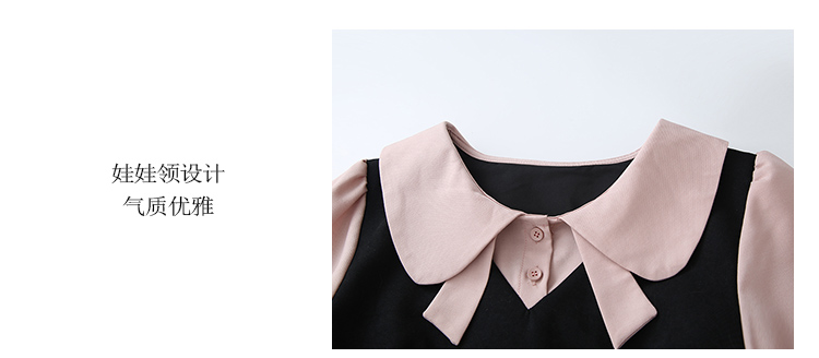 裙子女秋季2023新款法式復古小眾設計娃娃領假兩件黑色長袖連衣裙