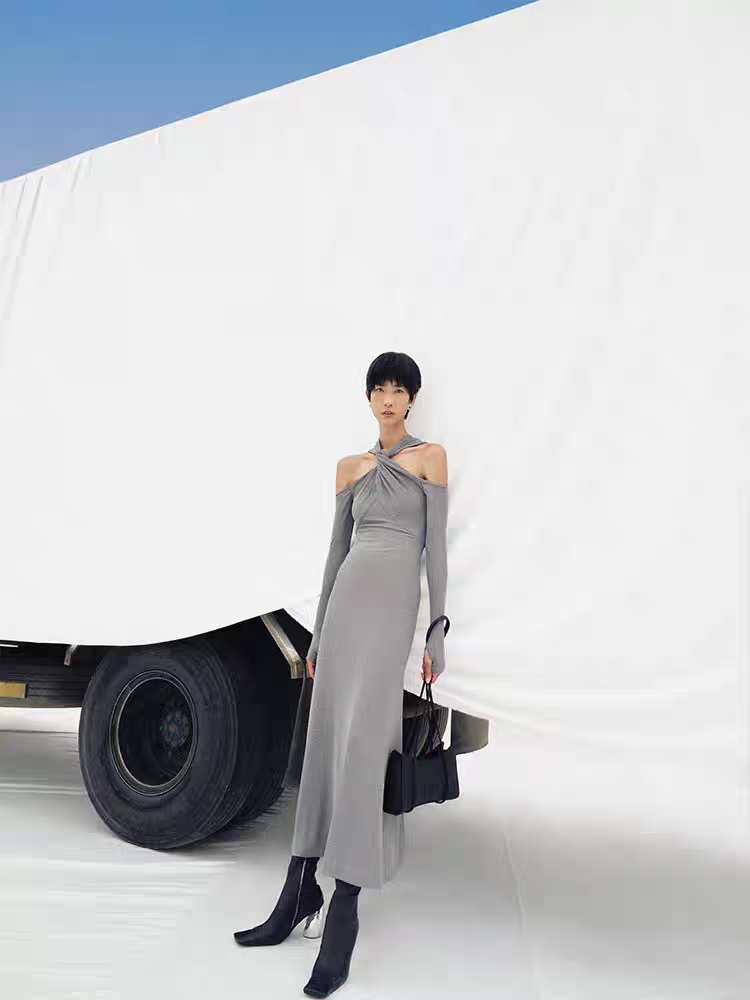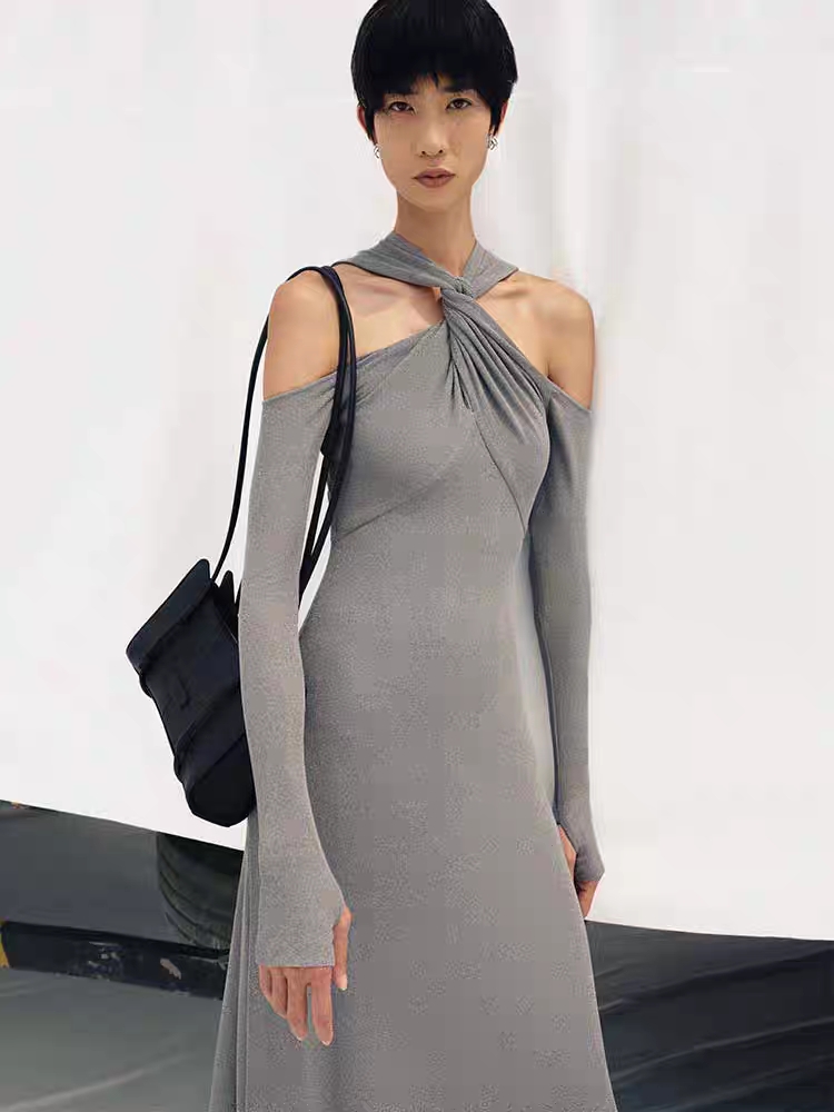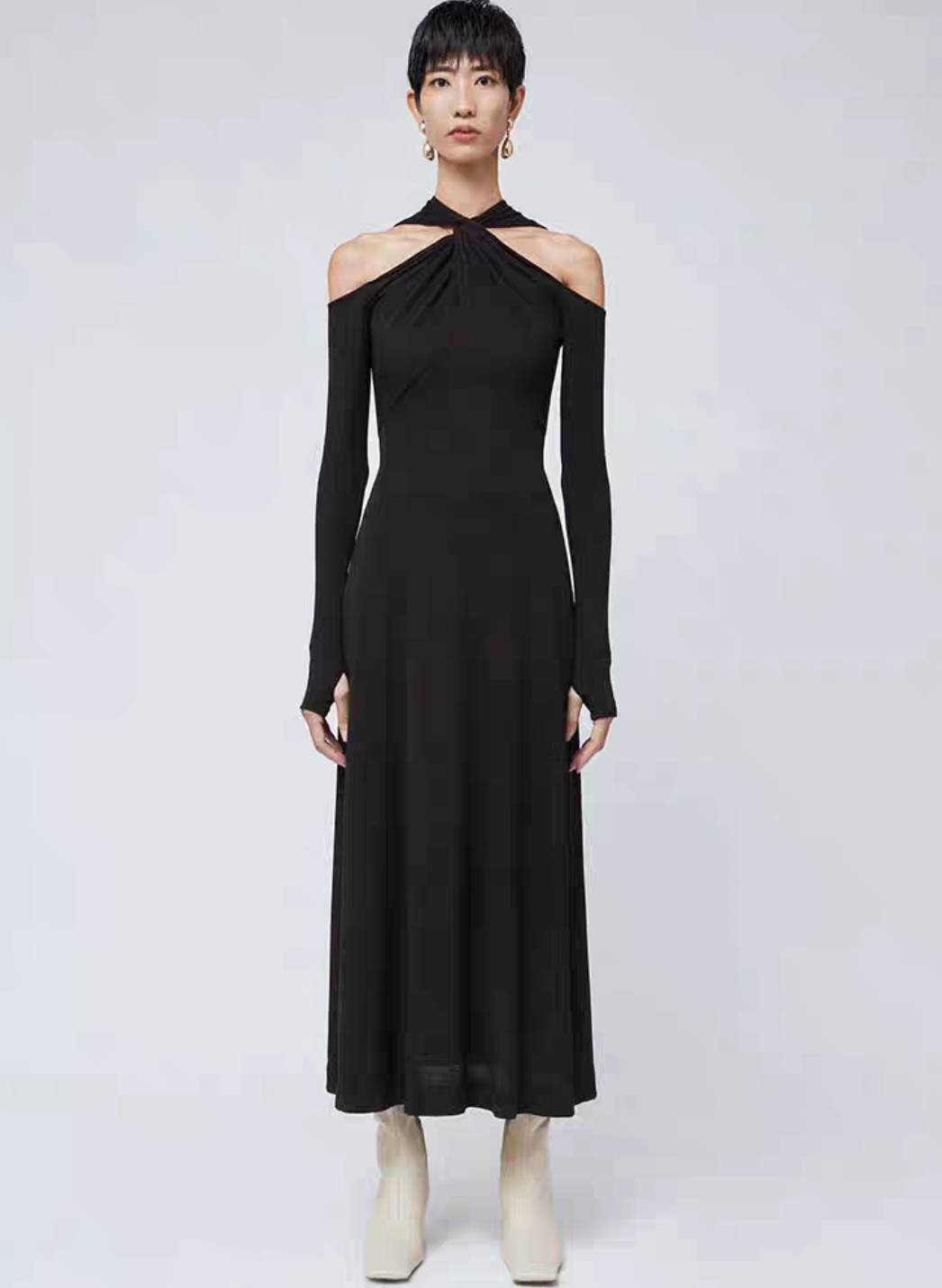 越南設計師高級感交叉針織露肩彈力長裙打底裙連衣裙