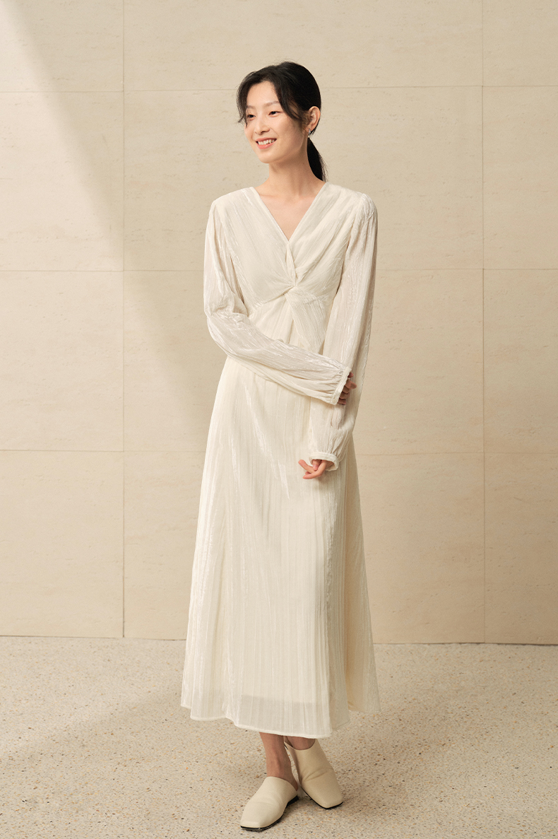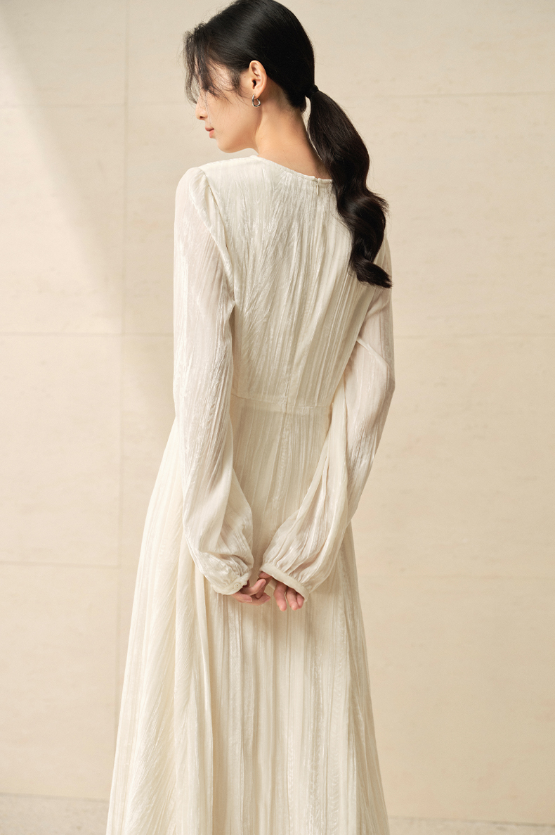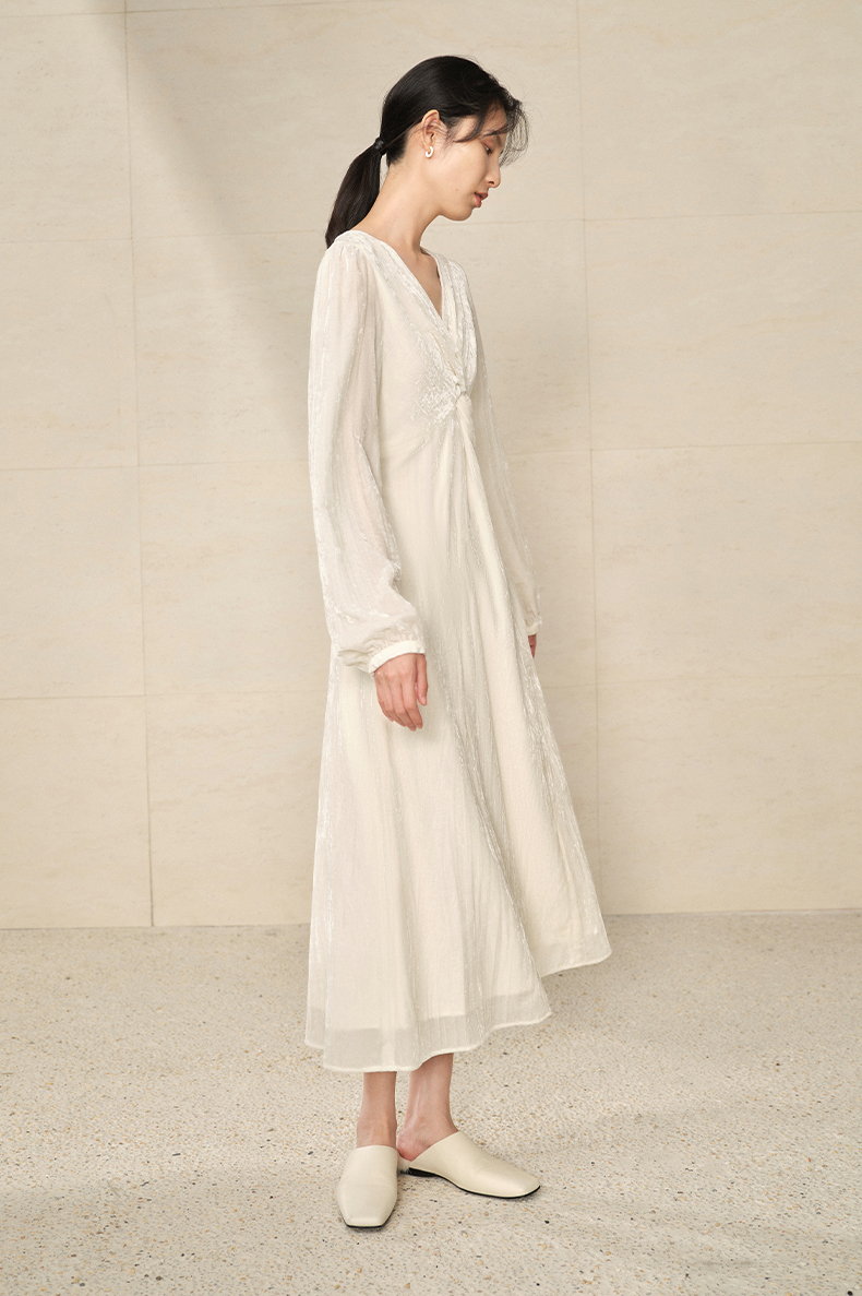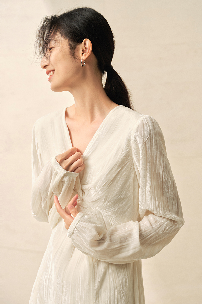 orange desire溫柔長袖連衣裙女2023秋季新款顯瘦V領高腰緞面裙子