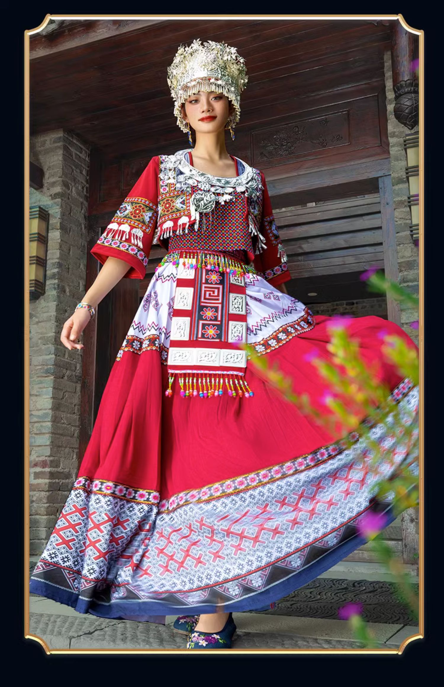 阿卯苗族服裝女民族服飾五月攝影紅色立領上衣長裙飄帶帽子項圈全