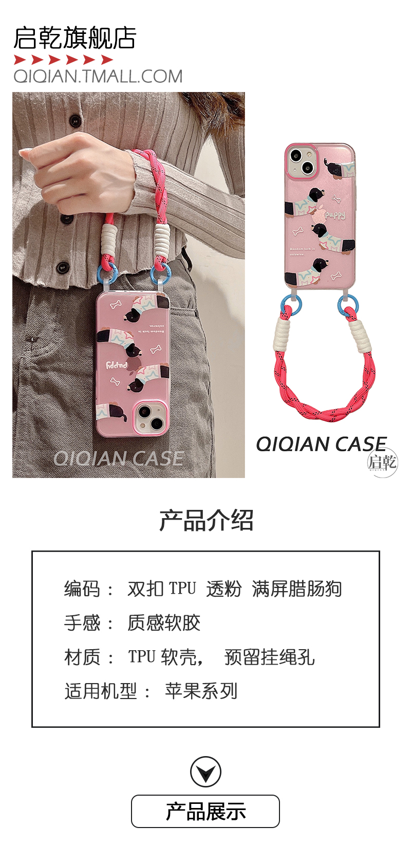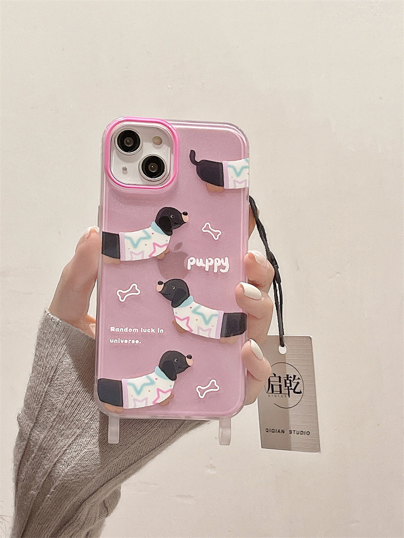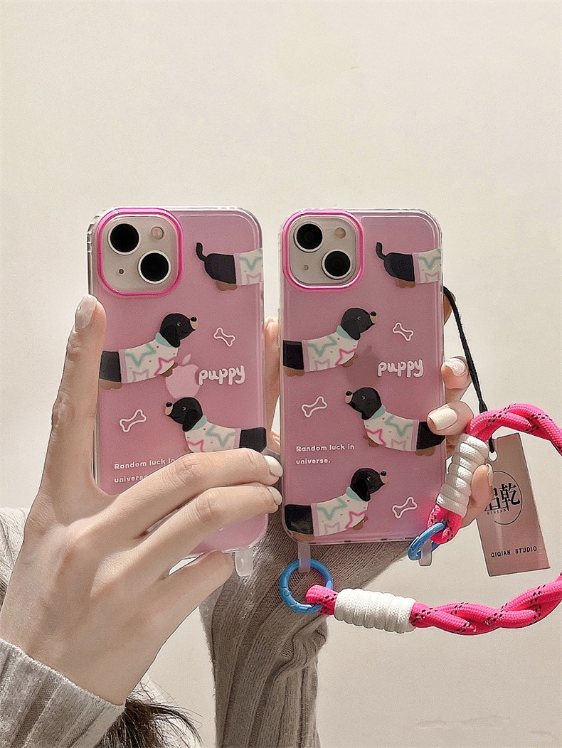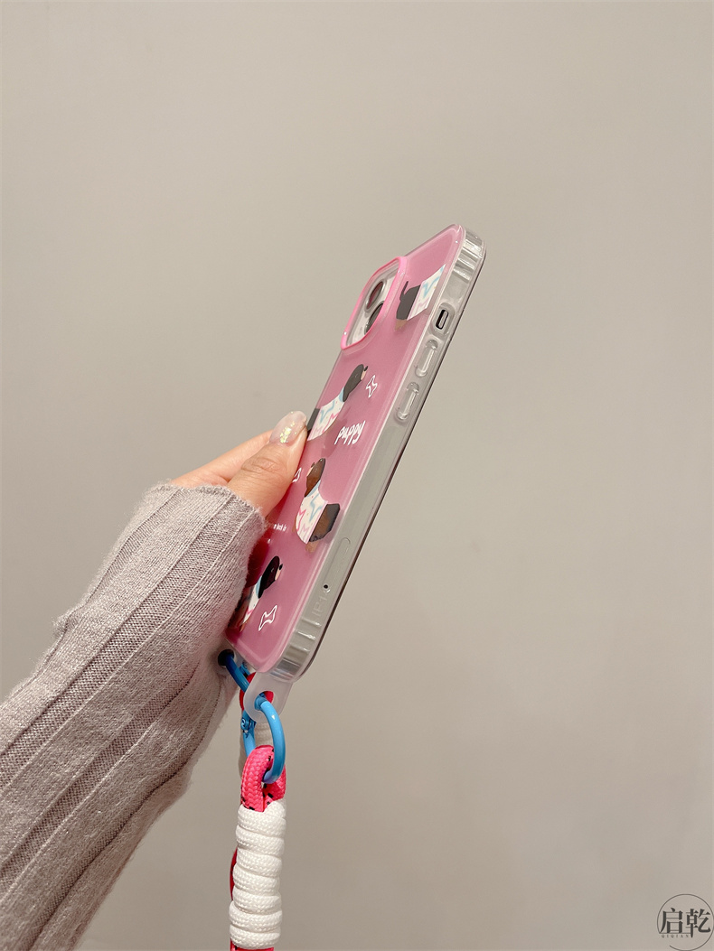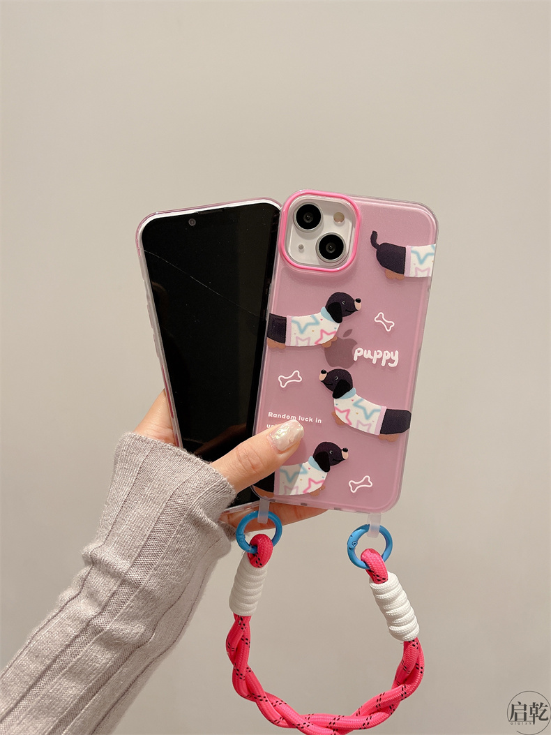 啟乾 粉色臘腸狗手腕帶iPhone14手機殼適用蘋果13promax透明軟殼12/11可拎鏈條掛繩少女心可愛卡通新款防摔