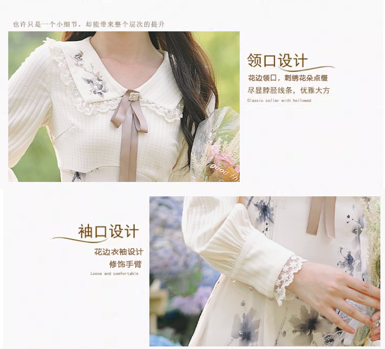 秋季法式小個子女裝水墨印花假兩件拼接連衣裙大擺裙寬松減齡長裙