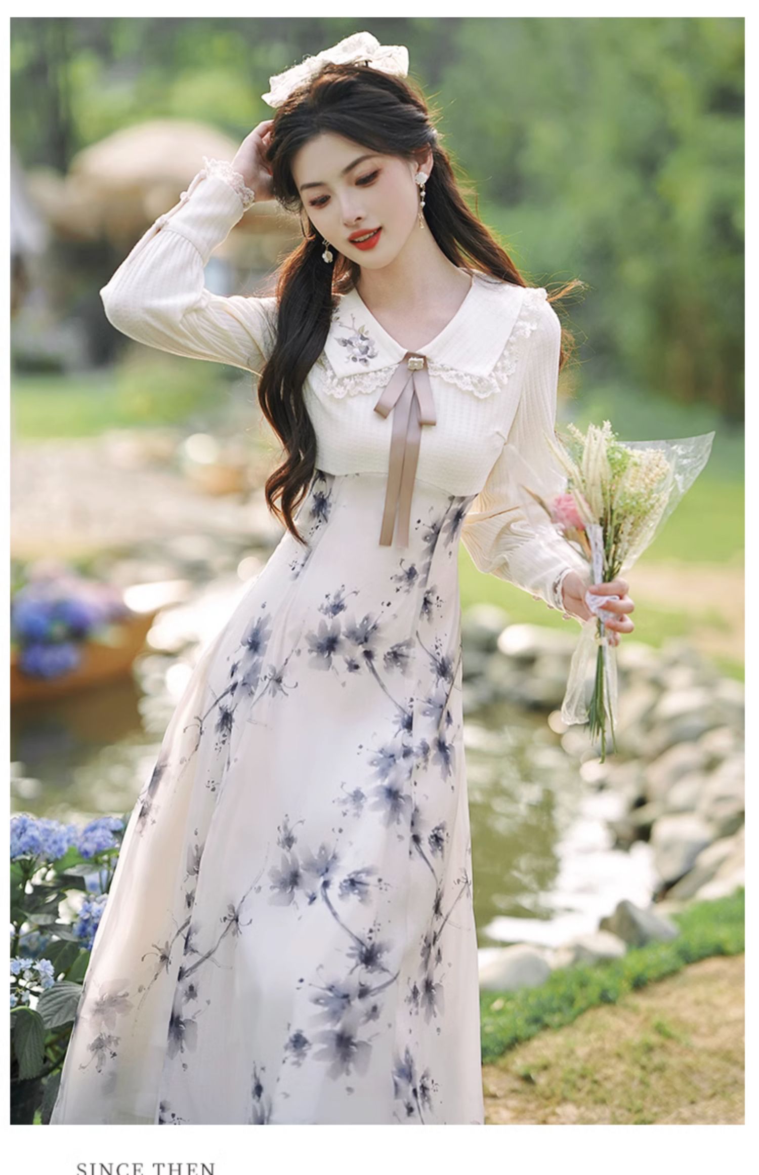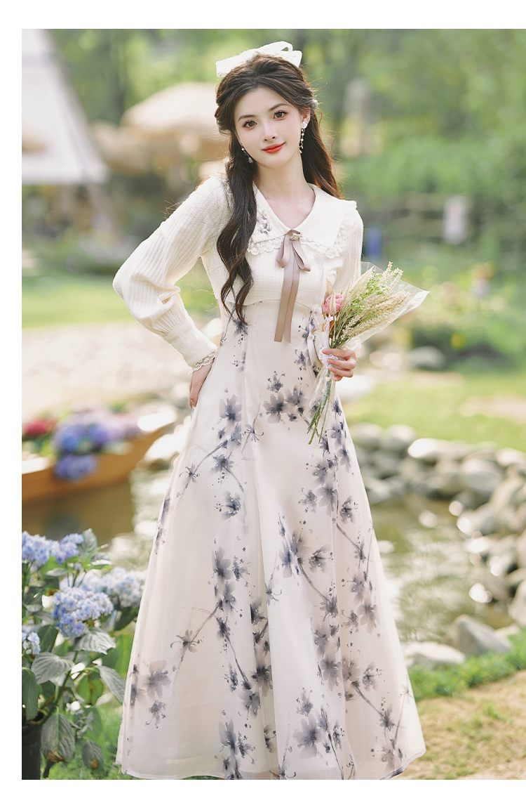 秋季穿搭高級感法式復古水墨印花拼接連衣裙2023新款收腰氣質長裙