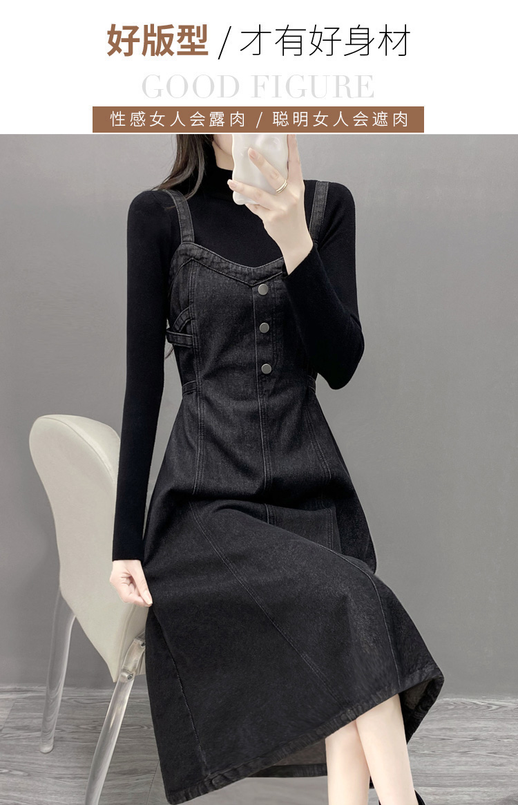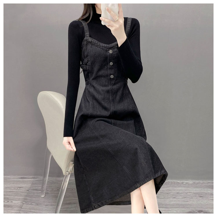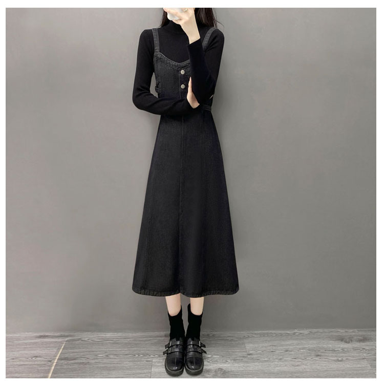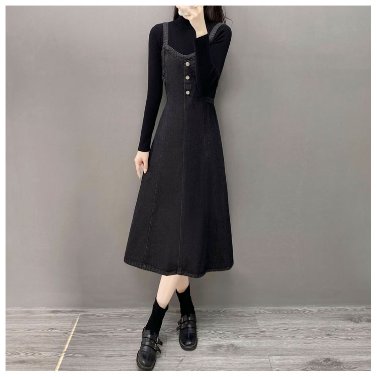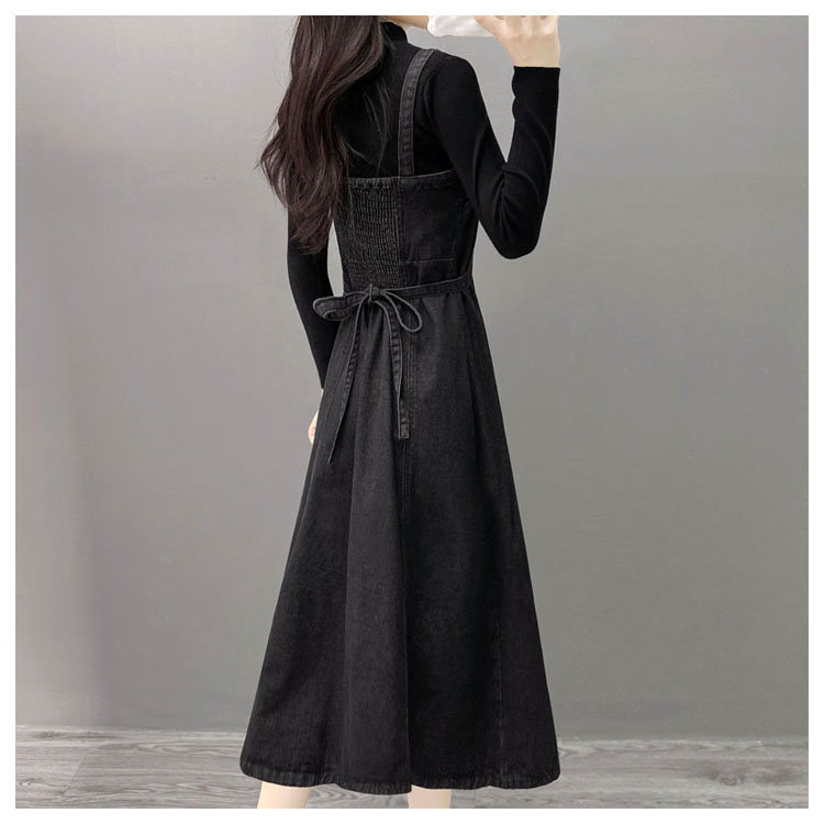 2023中長裙新款秋季大碼百搭寬松收腰背帶長裙牛仔吊帶a字連衣裙