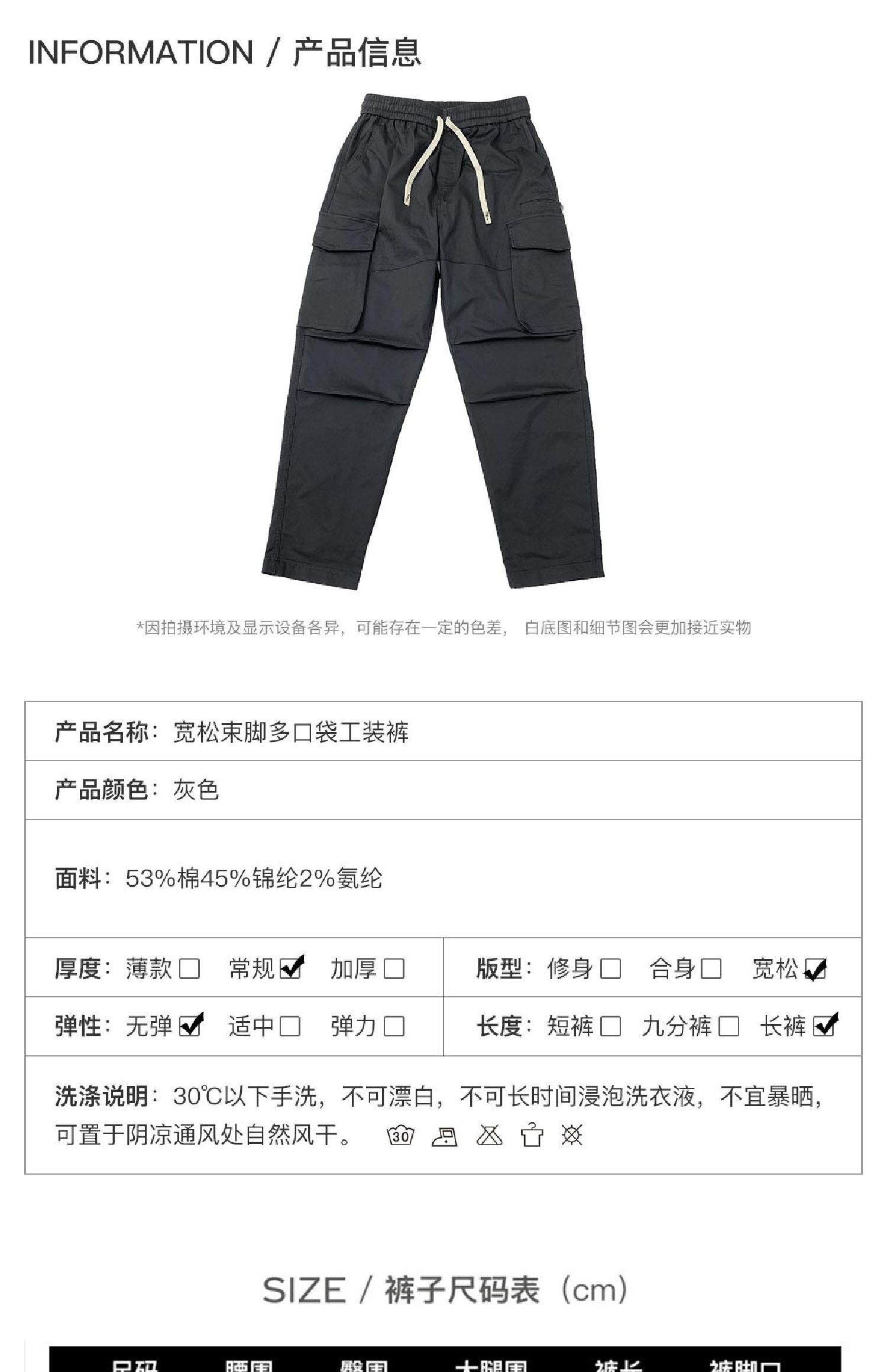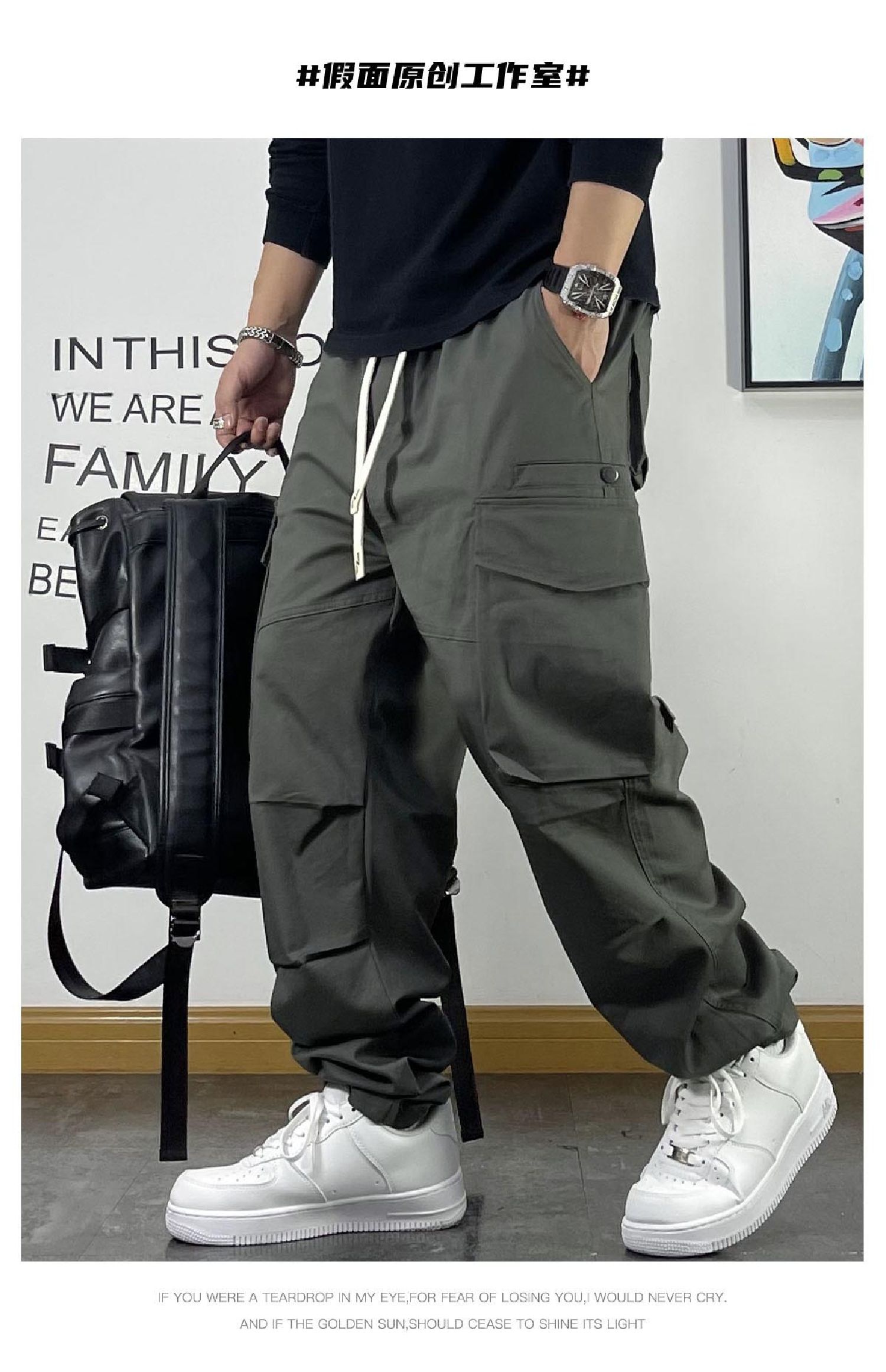 青年潮流大口袋機能風休閑褲男寬松直筒抽繩純色多口袋秋款工裝褲