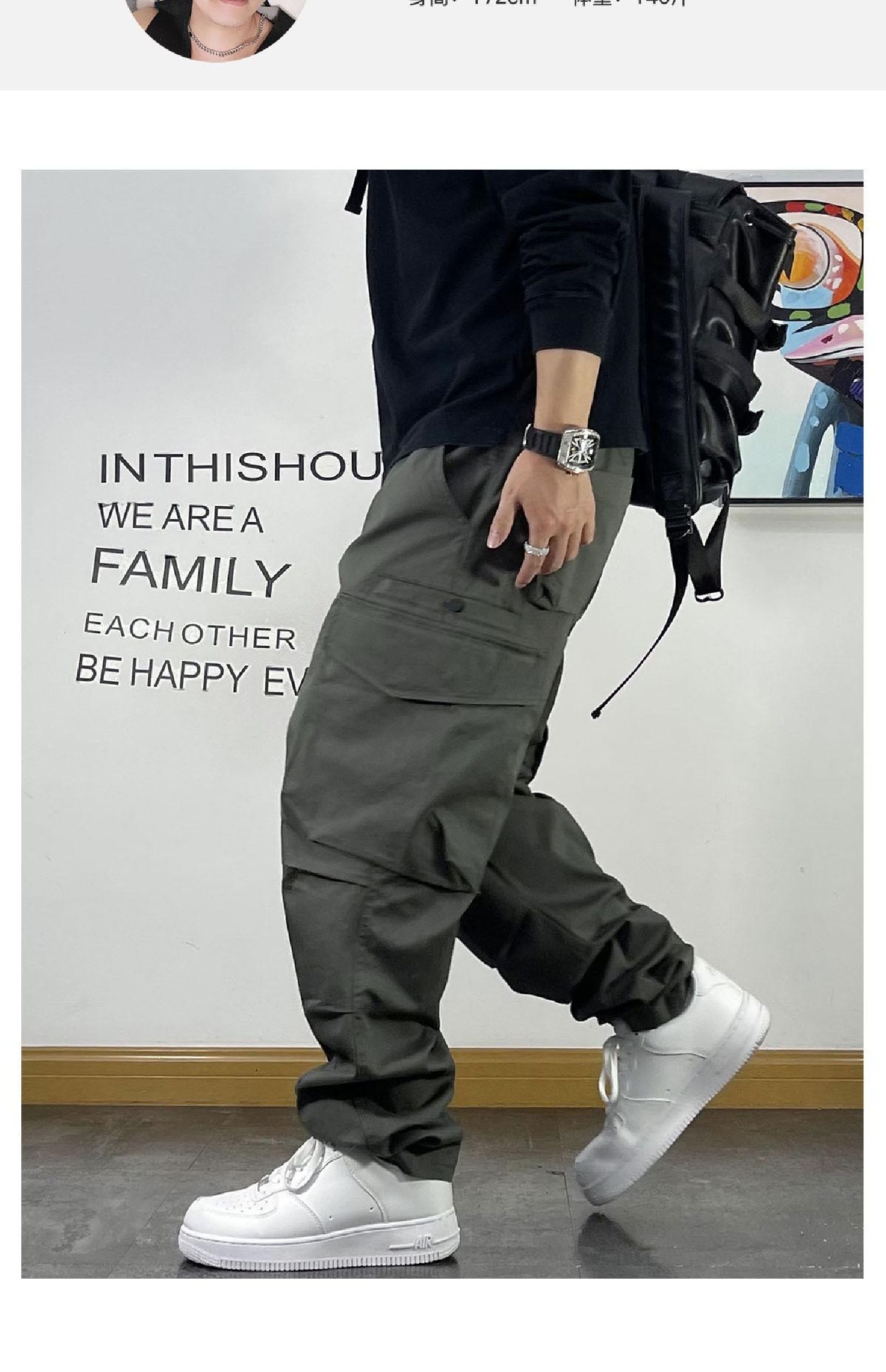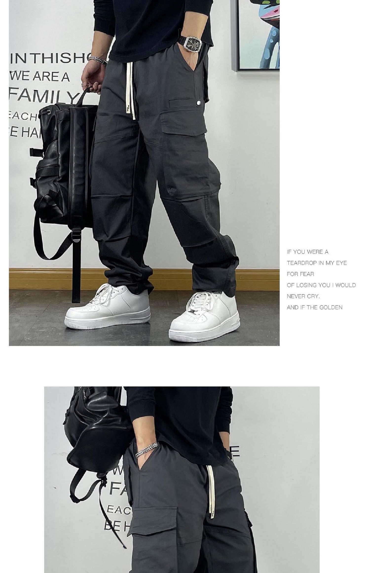 男士多口袋工裝褲寬松直筒街頭潮流傘兵褲春秋款腰帶裝飾休閑褲子