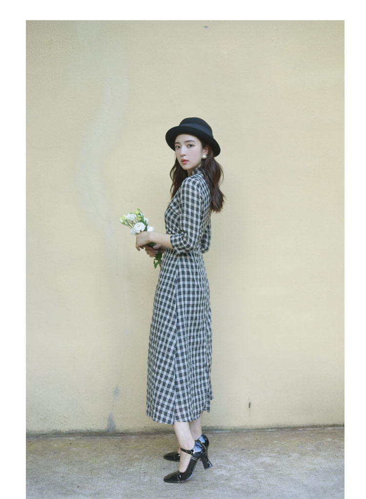 2023新款早秋季改良旗袍連衣裙復古格子七分袖學院風文藝裙子長袖