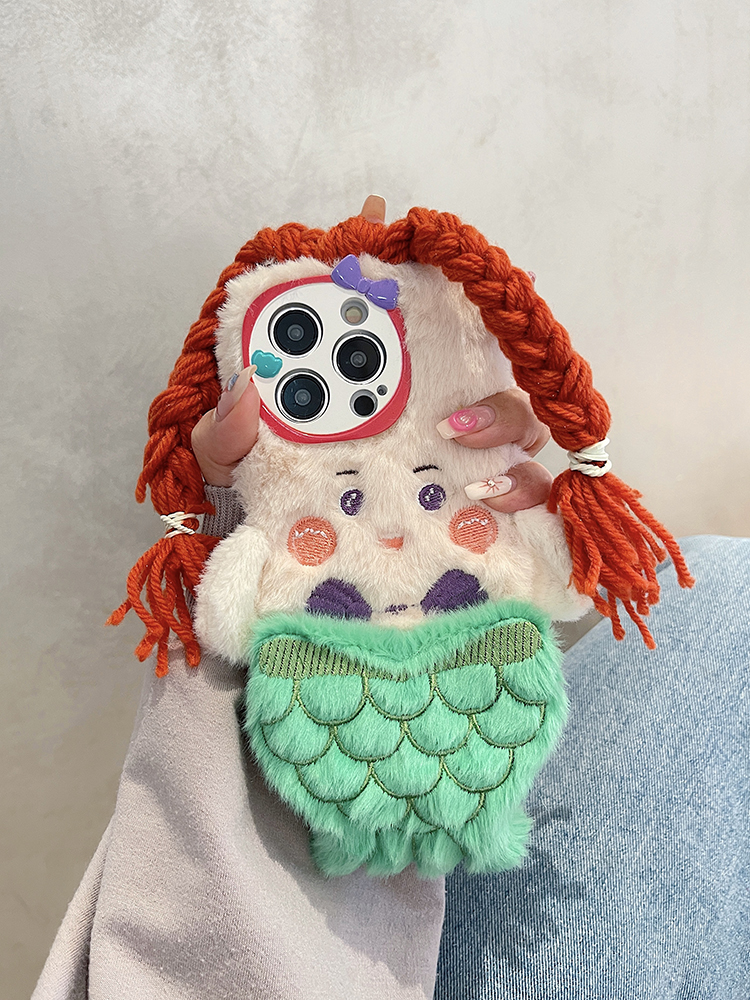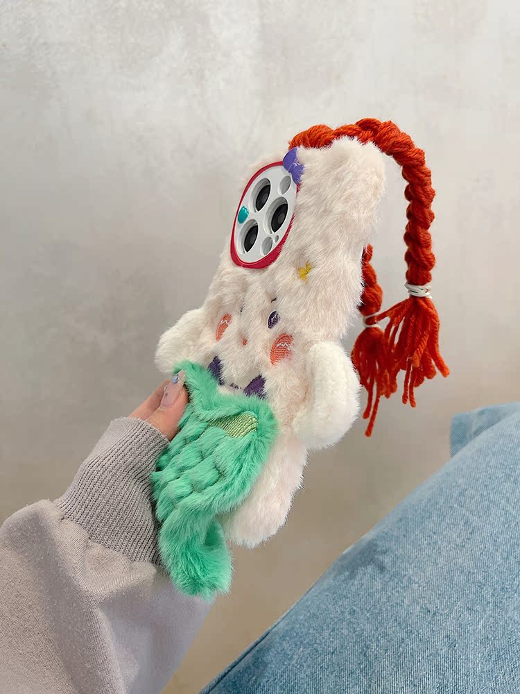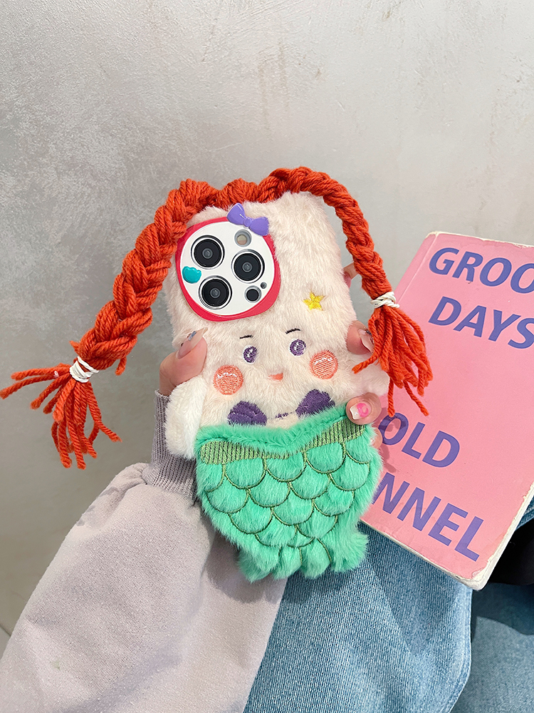 搞怪可愛辮子美人魚適用蘋果15promax手機殼iphone14pro秋冬毛絨13新款12小眾高級感11防摔max保護套plus暖手