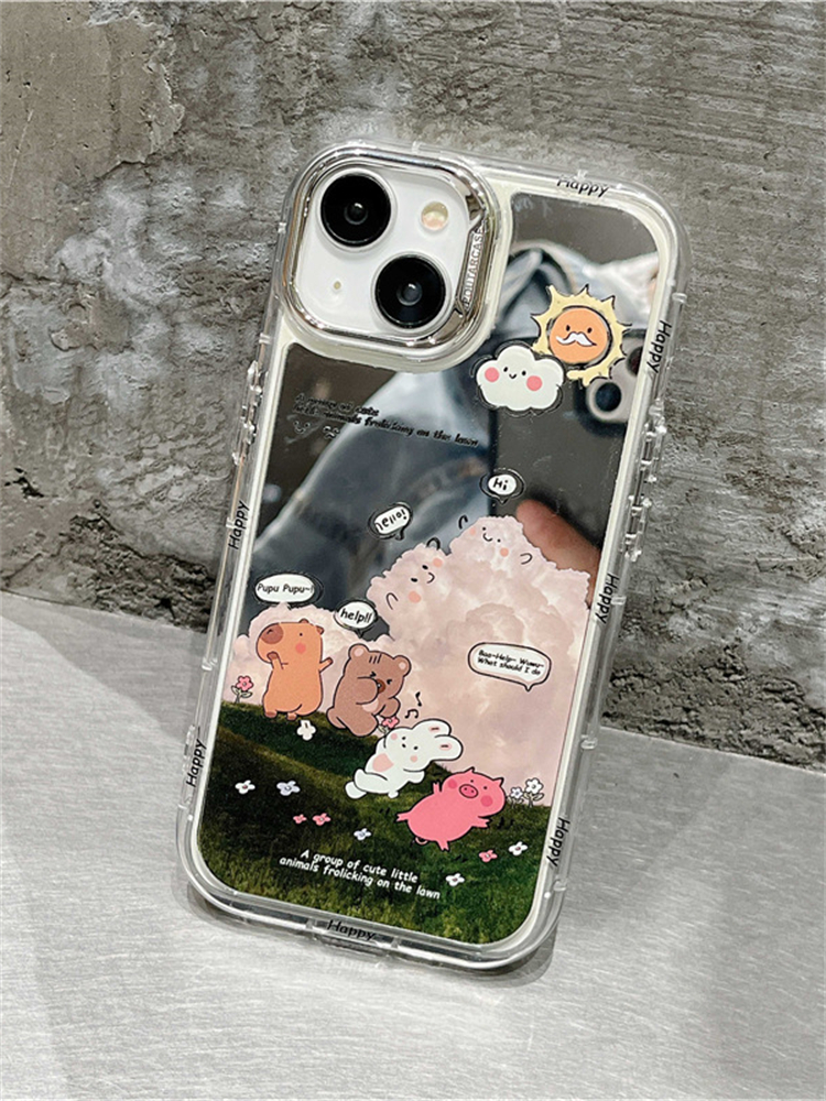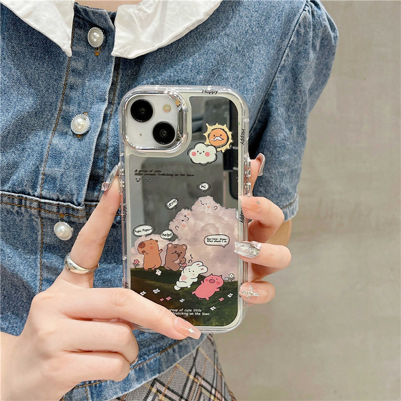 小清新可愛卡通補妝鏡子面白云草地四只小動物女士iPhone14ProMax手機殼適用于12蘋果13全包邊鏡頭防摔保護套
