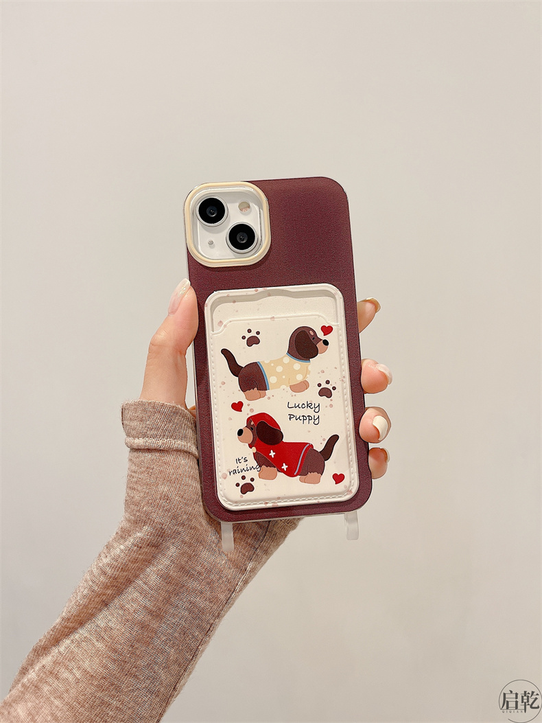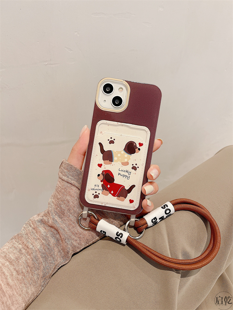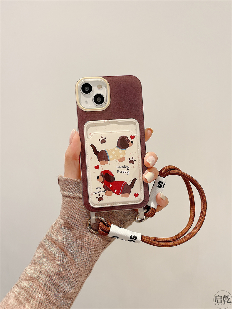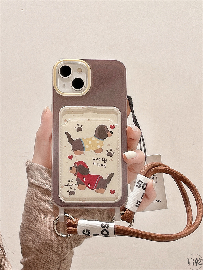 啟乾 潑墨可愛臘腸狗iPhone15手機殼適用蘋果14/13promax卡包卡套軟殼12/11手腕帶鏈條掛繩棕色卡通新款女