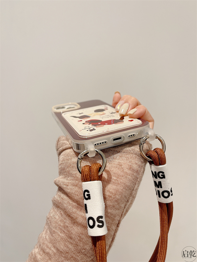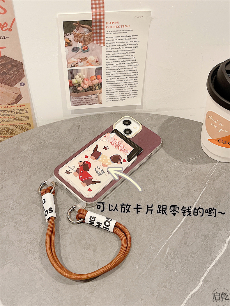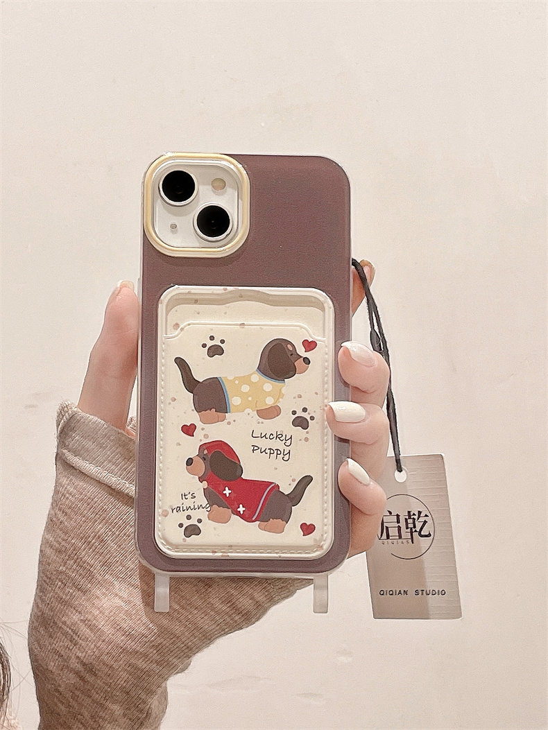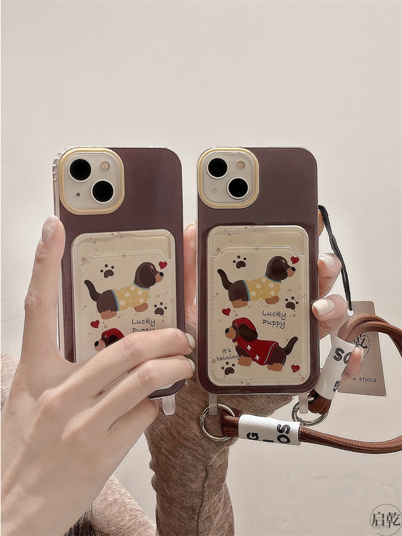 啟乾 潑墨可愛臘腸狗iPhone15手機殼適用蘋果14/13promax卡包卡套軟殼12/11手腕帶鏈條掛繩棕色卡通新款女