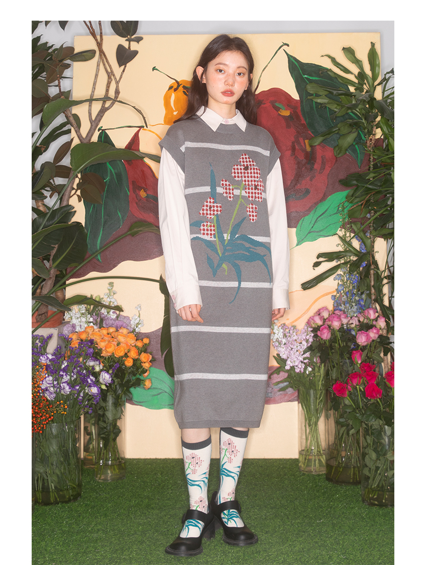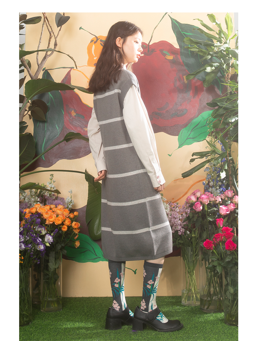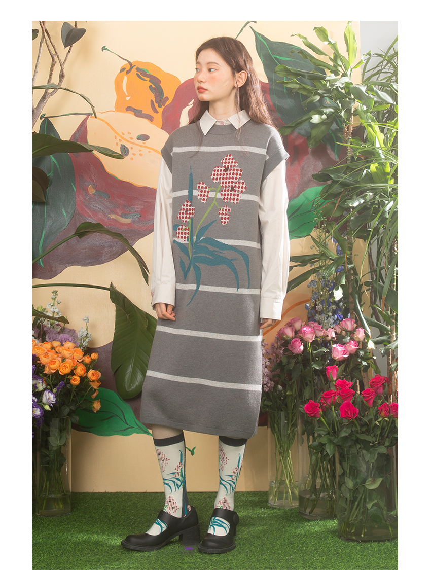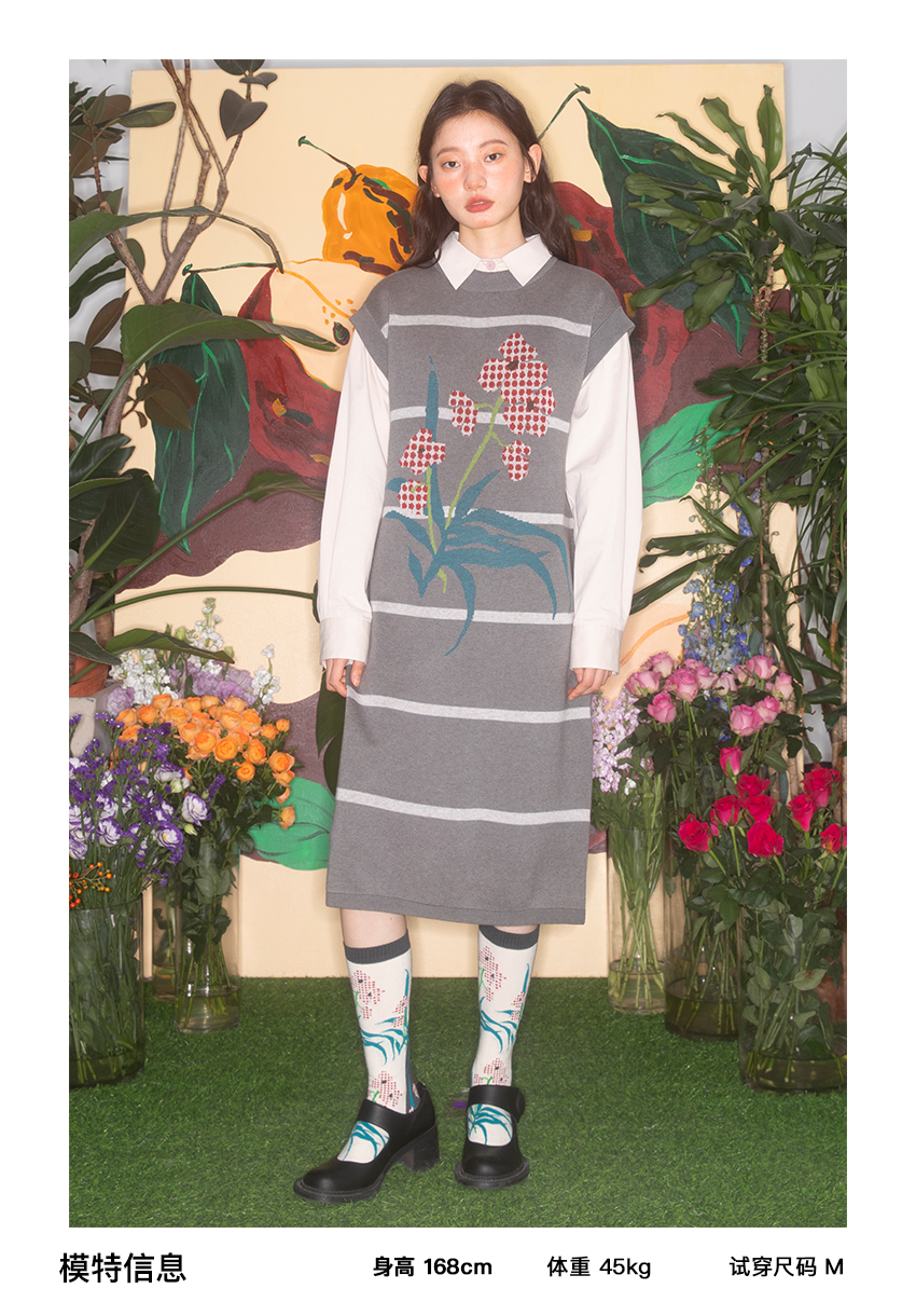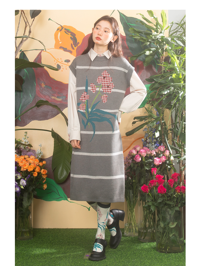 HHCH口海原創設計 復古波點蝴蝶蘭提花撞色條紋無袖針織連衣裙