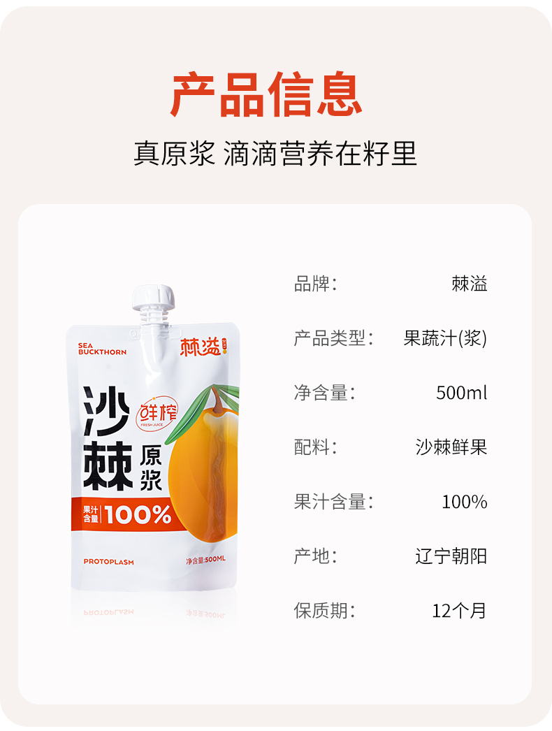 棘溢沙棘全果原漿300ml/袋100%果汁不提果油籽油高VC官方旗艦店