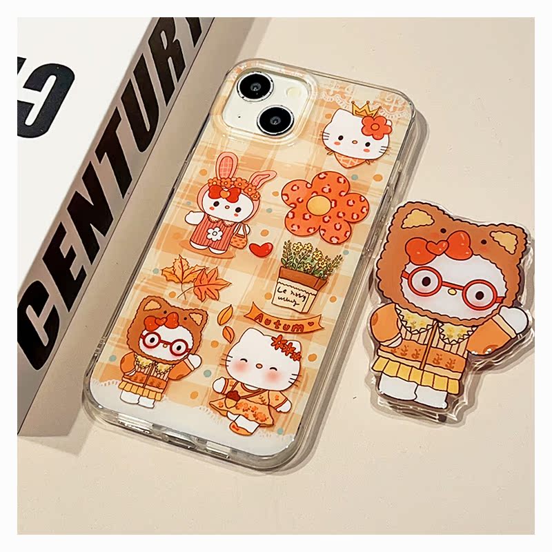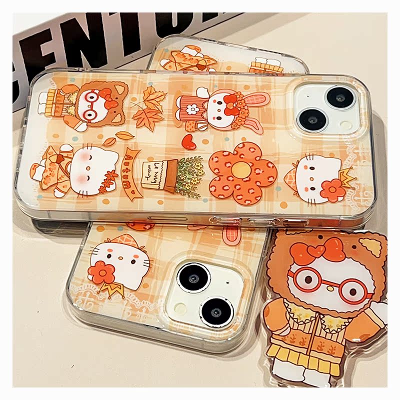 黃色格紋楓葉Kitty貓支架適用蘋果15promax手機殼iphone14女款15pro新款13可愛趣味創意12硬殼pro防摔11硅膠