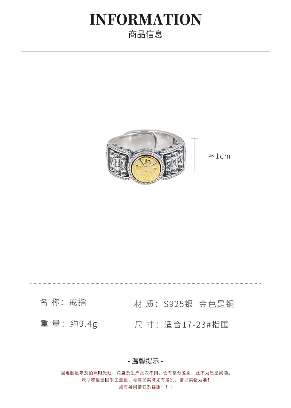 【時來日進斗金】純銀戒指S925銀復古六字真言指環個性設計男女