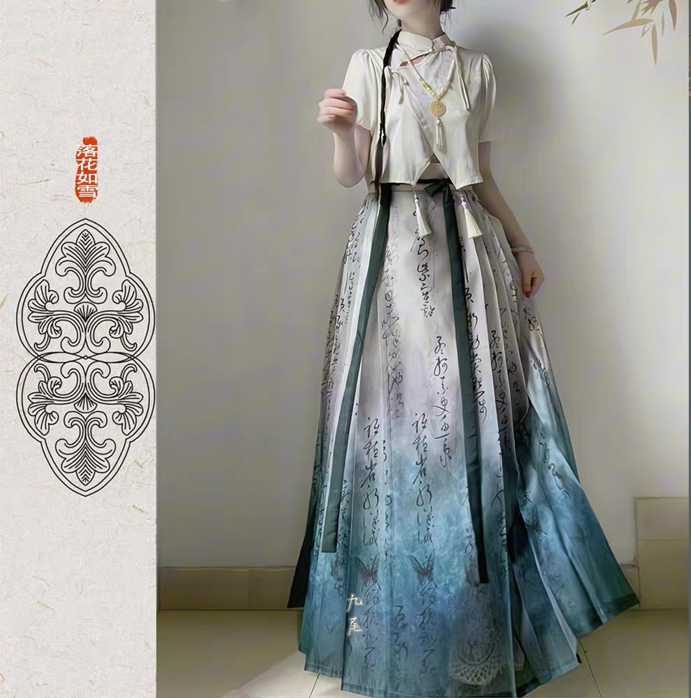 春夏新款原創國風一片式馬面裙女瘦明制漢服新中式印花清冷風套裝