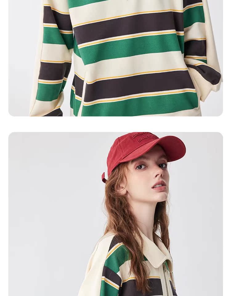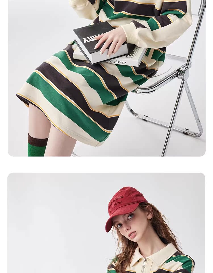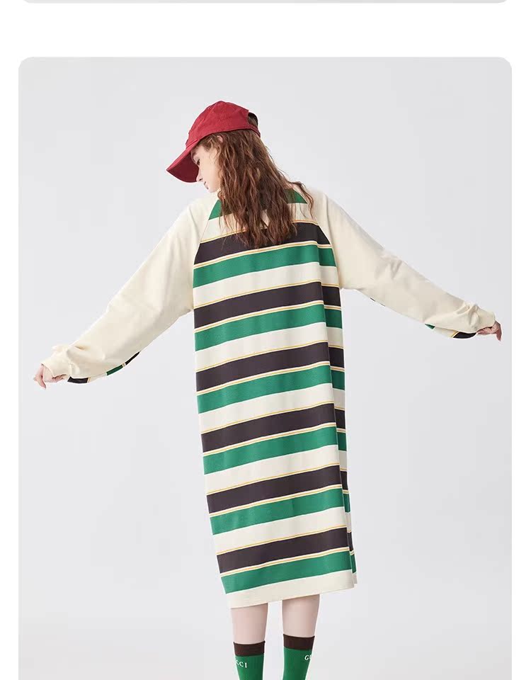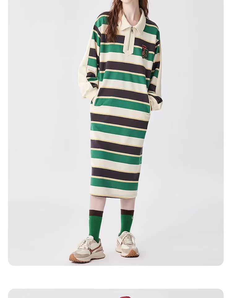 a02通勤連衣裙2023秋季新品時尚寬松遮肉綠寬條紋翻領長袖裙子