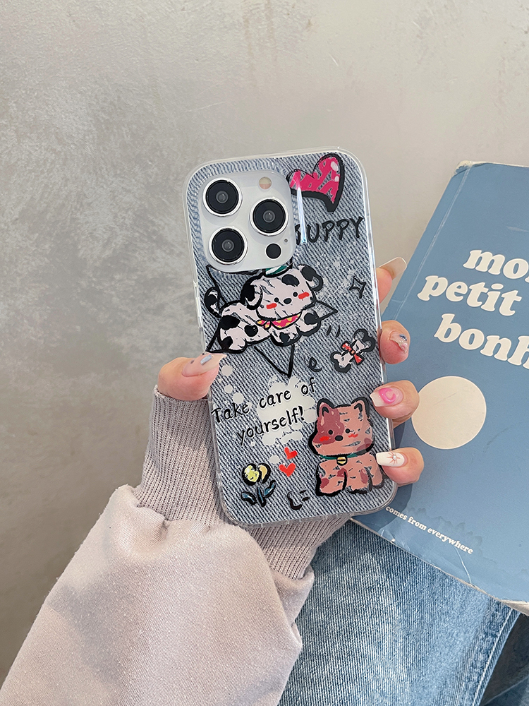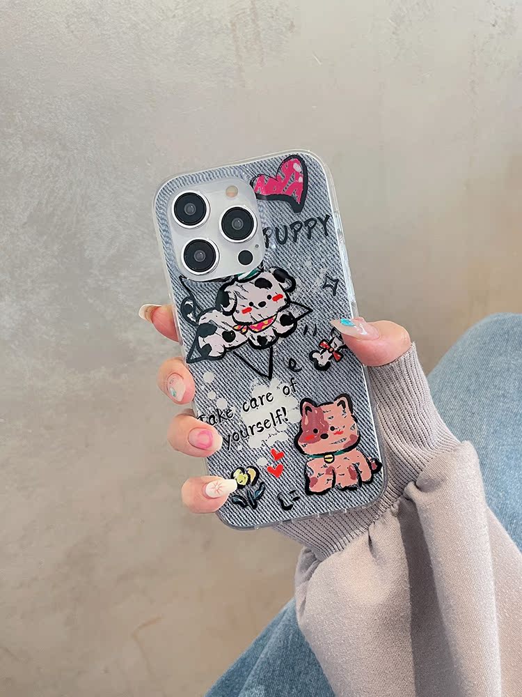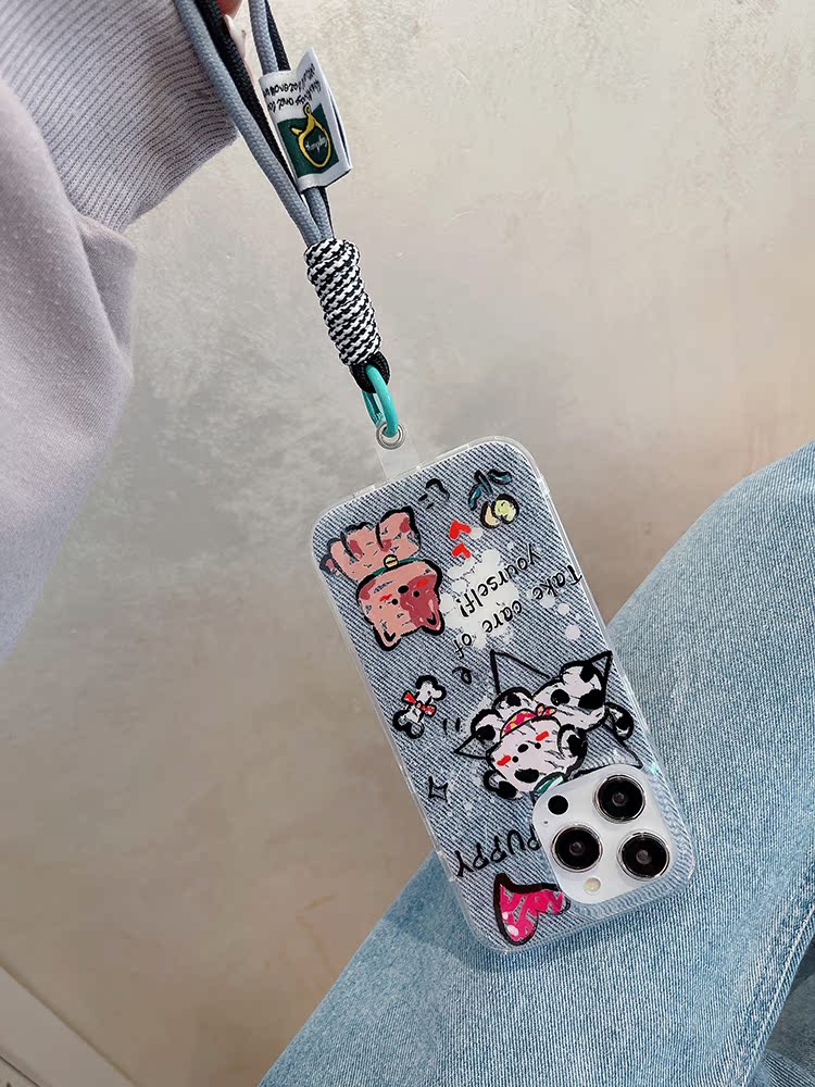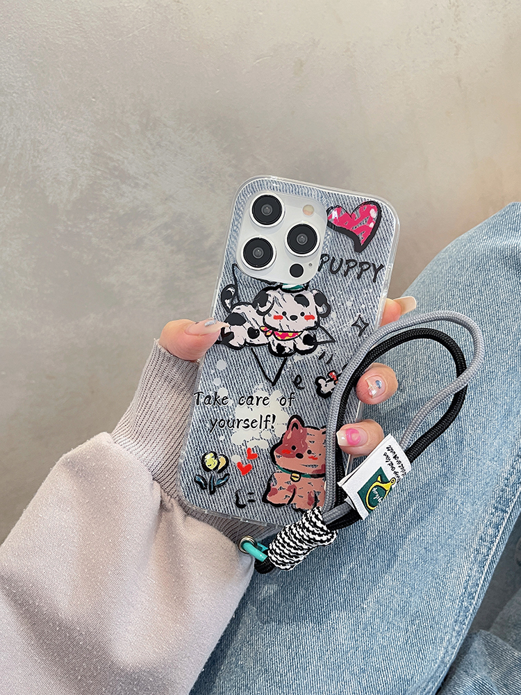 卡通牛仔紋可愛小狗適用蘋果15pro手機殼iphone14掛繩手腕13promax超火12新款2023女款11潮max保護套plus防摔