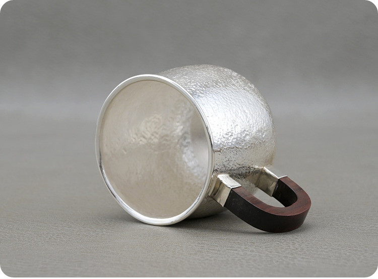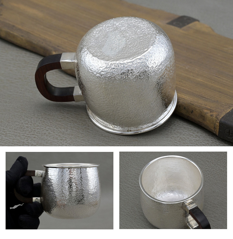 純色999純銀茶具手工錘紋茶杯雪花銀水杯整體足銀馬克杯帶手柄杯